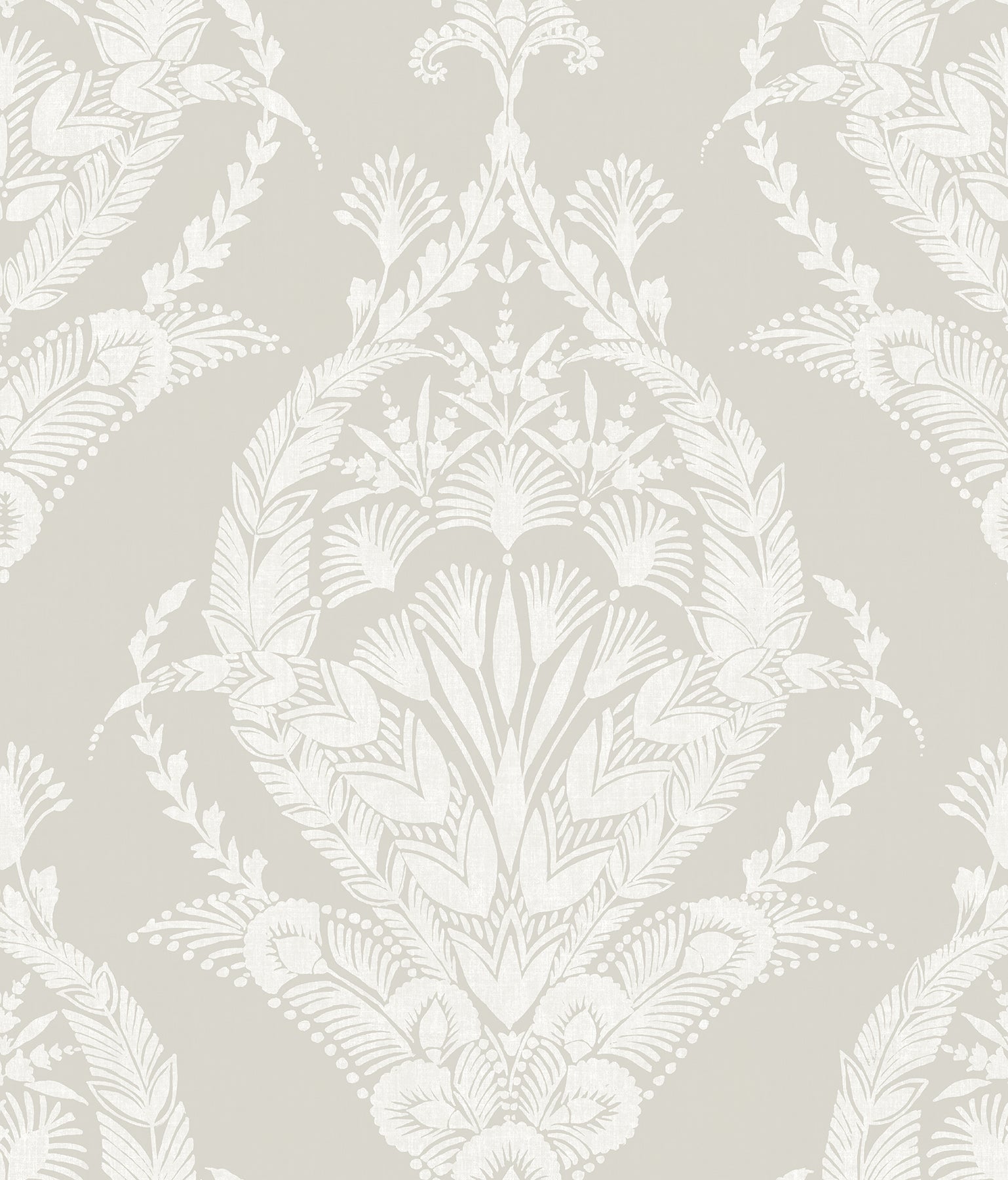 Bring a sense of grandeur to your interiors with this beautiful damask wallpaper. The flowing ogee structuring alternates between two medallion designs, both large in scale and featuring gorgeous botanical arrangements inked in distressed white and light grey inks against a cool grey backdrop. Arlie is an unpasted, non woven wallpaper.