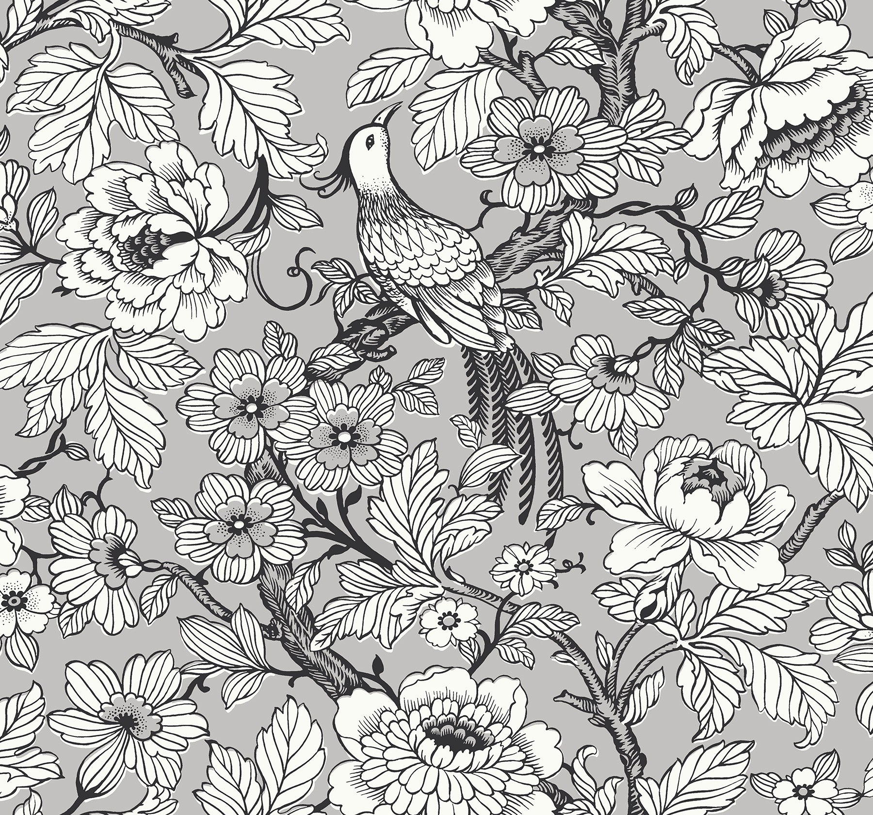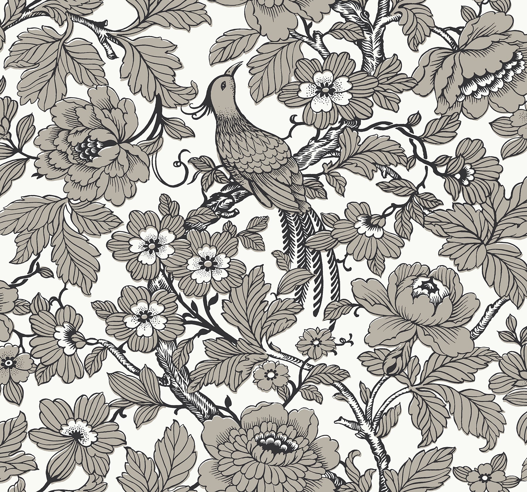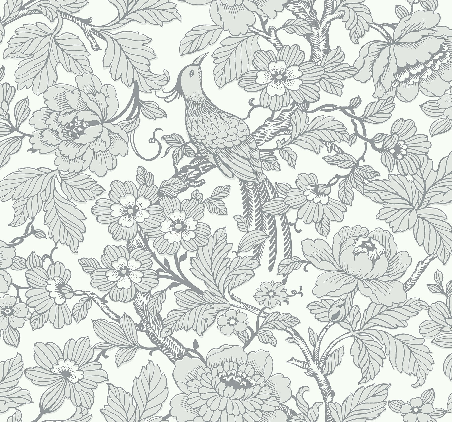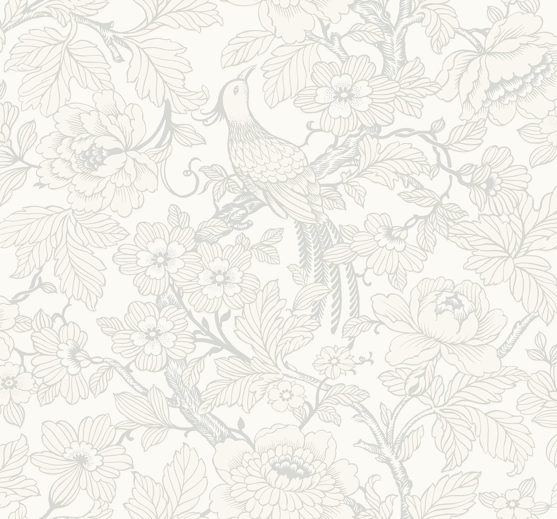 The gentle elegance of this floral chinoiserie wallpaper will bring subtle sophistication to your home. A bird perches among flowering branches, the illustrative details outlined in light grey with hints of metallic shimmer against an off-white background. Beaufort is an unpasted, screen acrylic coated wallpaper.