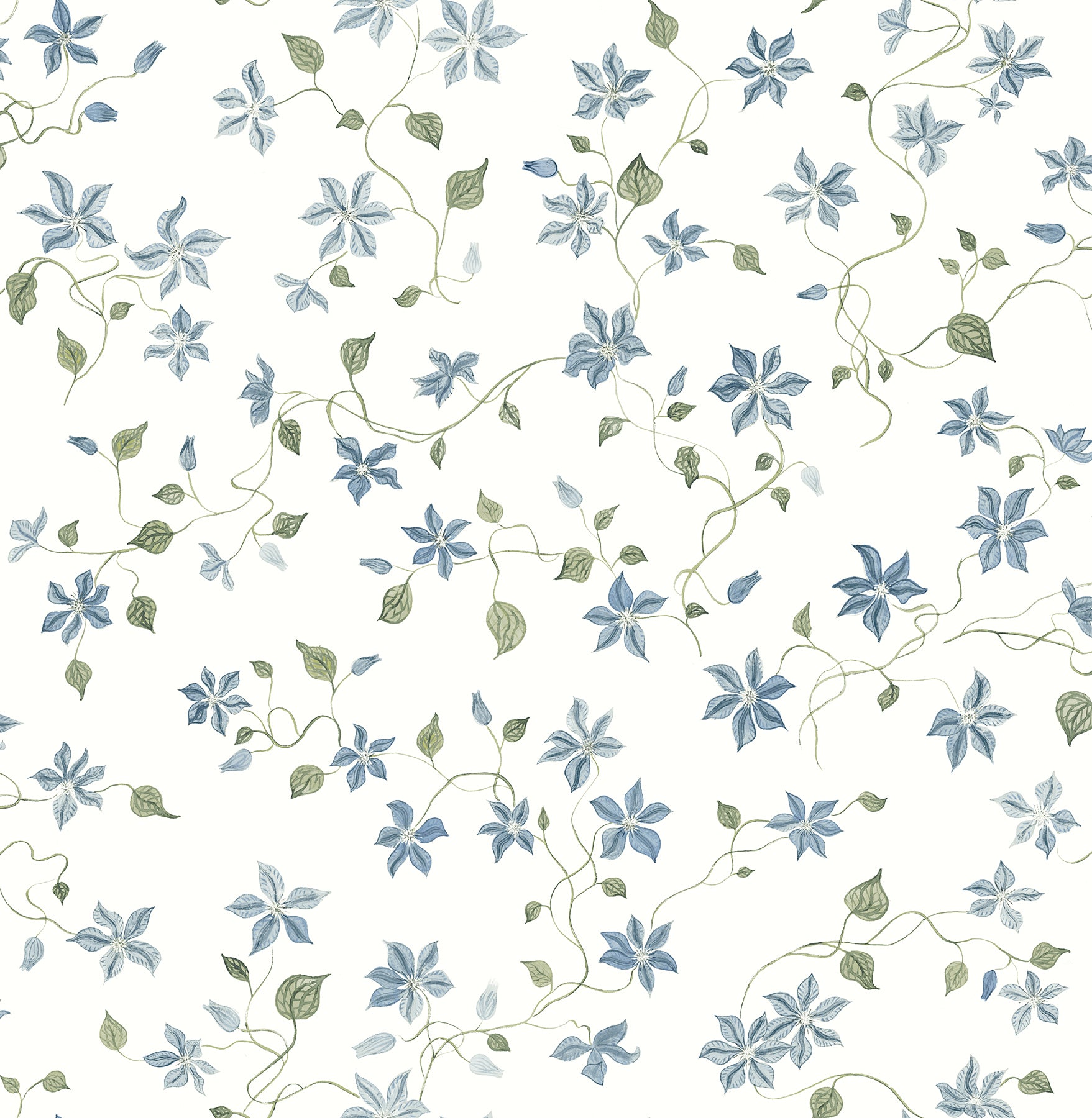This charming floral trail wallpaper is elevated by its painterly design. The blue blossoms and leaves of the winding vines are layered with delicate, watercolor detailing. Artwork by Rachel Rogers. Betsy is an unpasted, non woven wallpaper.