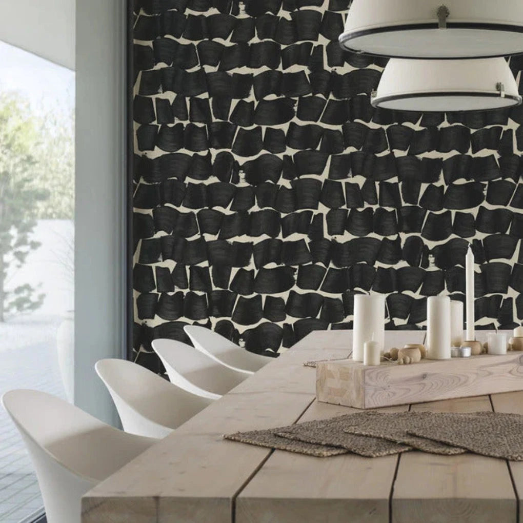 The Brushed Ink and broad, swaying horizontal strokes of Shodo calligraphy inspire a pattern of artistic expression with cultural tradition, shown in black on a tan canvas. This Brushed Ink Wallpaper measures approximately 27 inches wide by 27 feet long, measuring approximately 60.8 square feet per roll. The modern aesthetic of natural form.