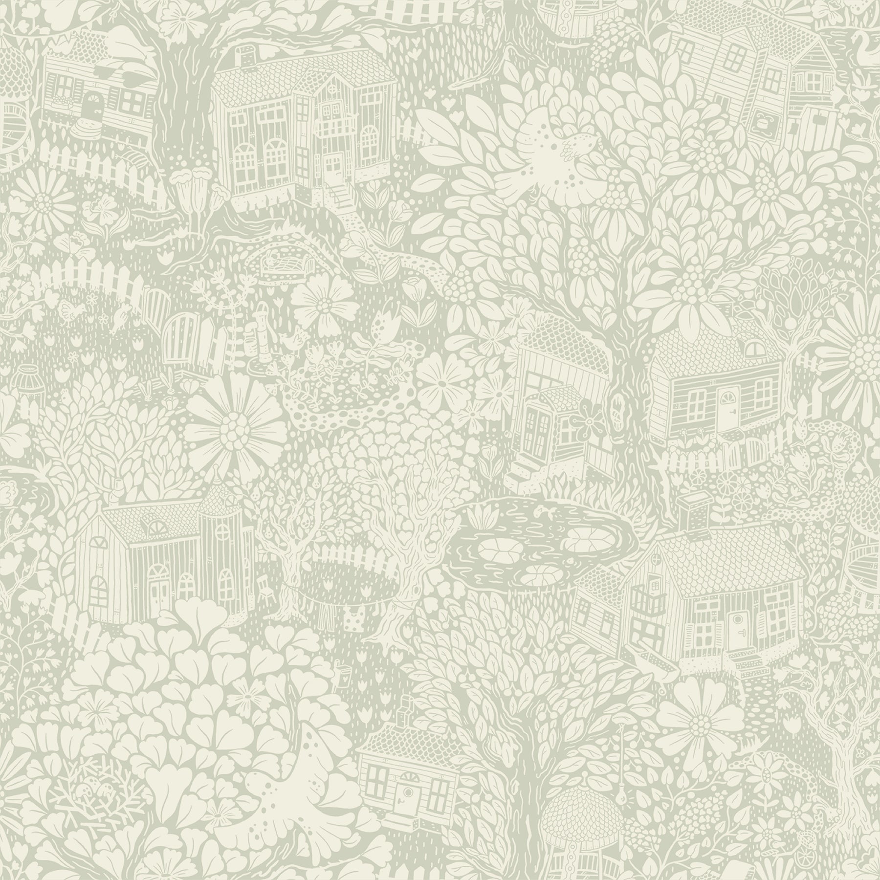 Feel as if you're stepping into a storybook with this charming, Scandinavian-inspired wallpaper. The woodland village features picturesque cabins, sturdy oaks, floral gardens, and animal friends - all inked in shades of green, blue, red, and yellow against a sandy-white backdrop. Bygga Bo is an unpasted, non woven wallpaper.