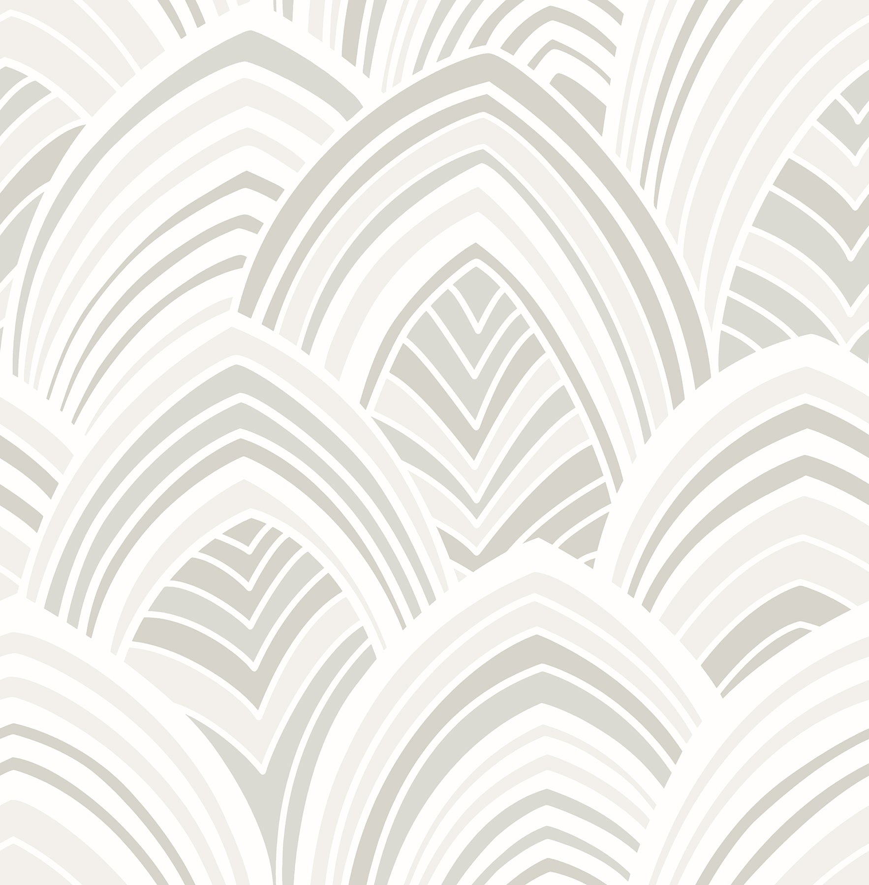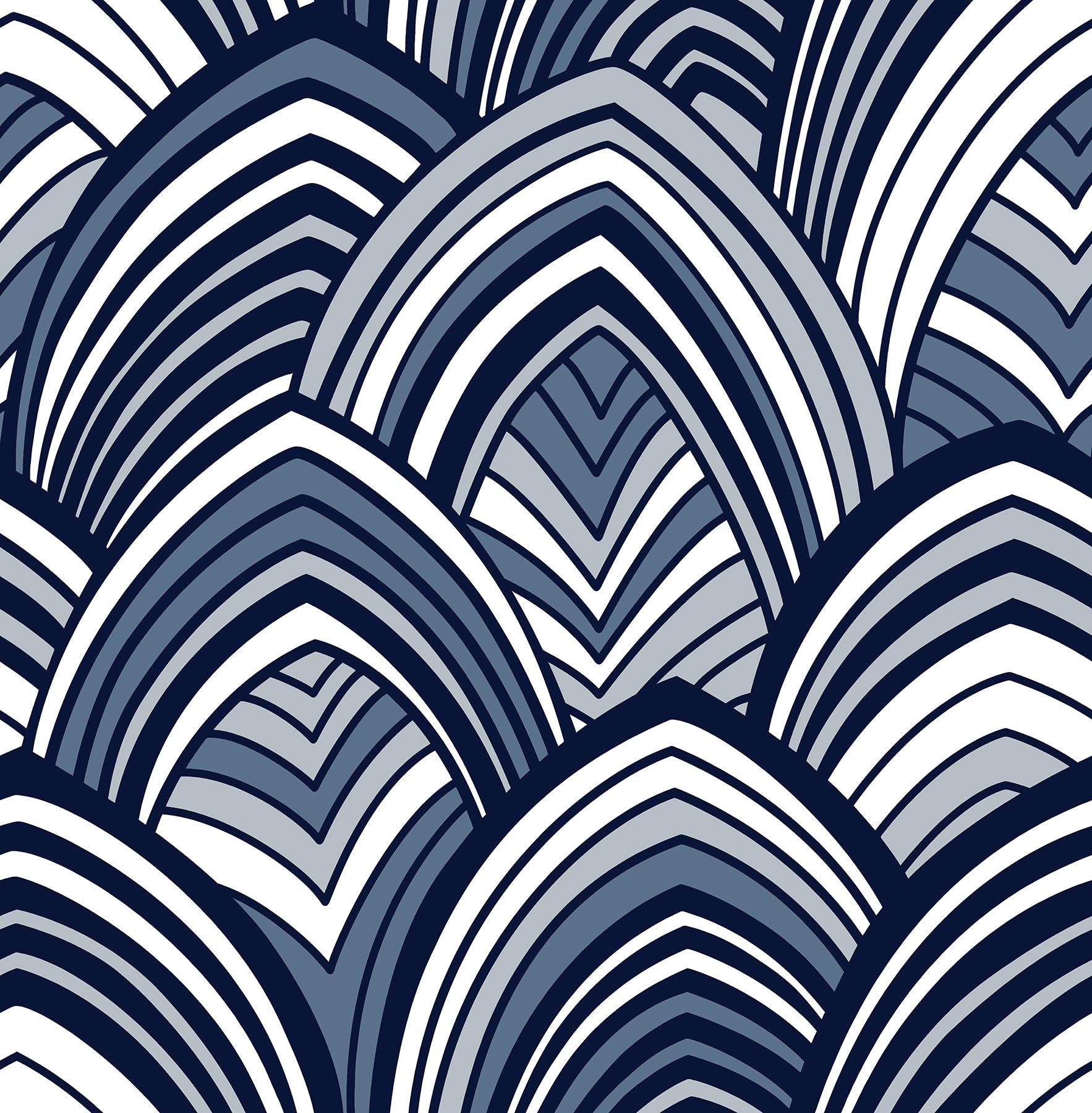 Tropical inspiration meets glamorous application in this lavish wallpaper. Staggered in layers, the leaf-shaped arches are detailed with metallic greys and blue, with the deepest blue areas composed of velveteen flock. Cabarita is an unpasted, non woven wallpaper.