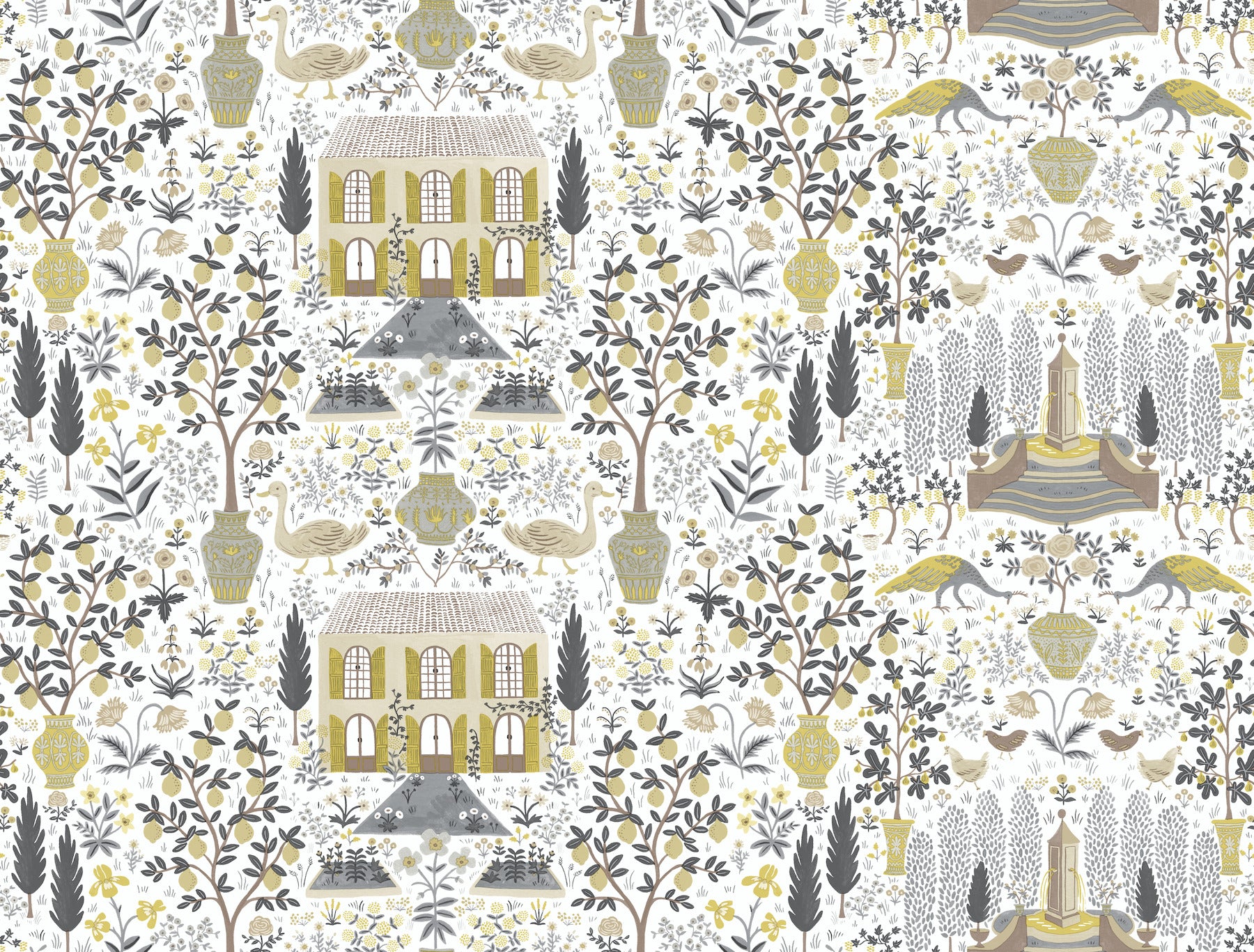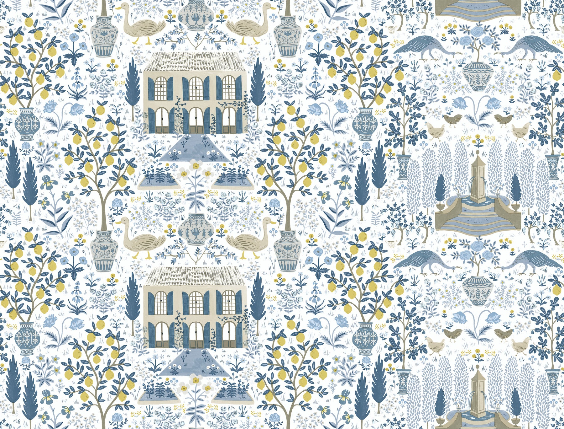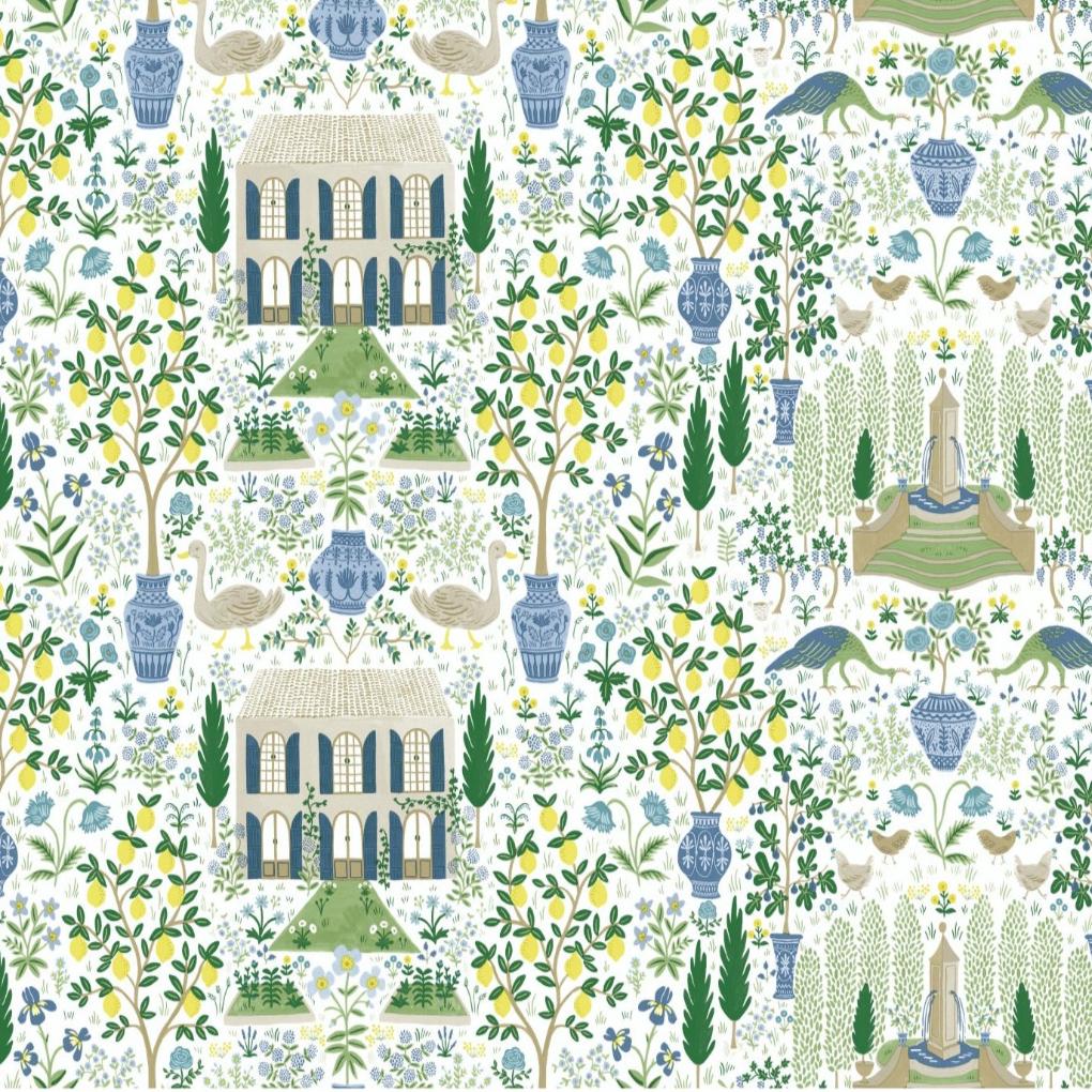 Inspired by a property of the same name in Gascony, France and an antique pattern from Yorkís archives, the Rifle Paper Co. Camont print features an illustration of an 18th-century French farmhouse and the fig trees, lemon trees, animals and flowers of itís pastoral grounds. This Camont Wallpaper measures approximately 27 inches wide by 27 feet long, covering About 60.8 square feet per roll. Printed on an unpasted paper and created with the highest quality of craftsmanship, this wallpaper is easy to install; simply apply paste to paper and hang.