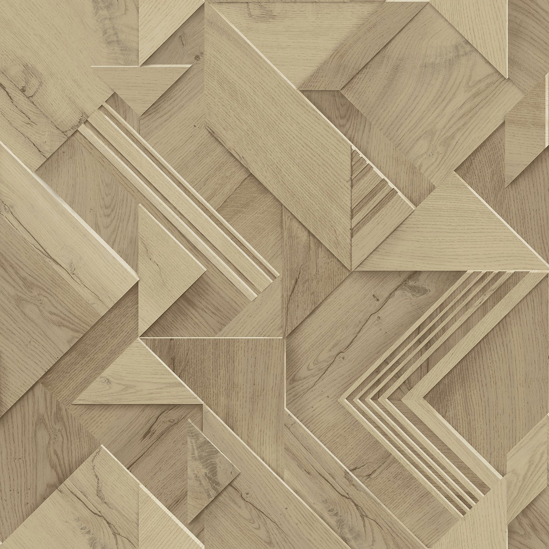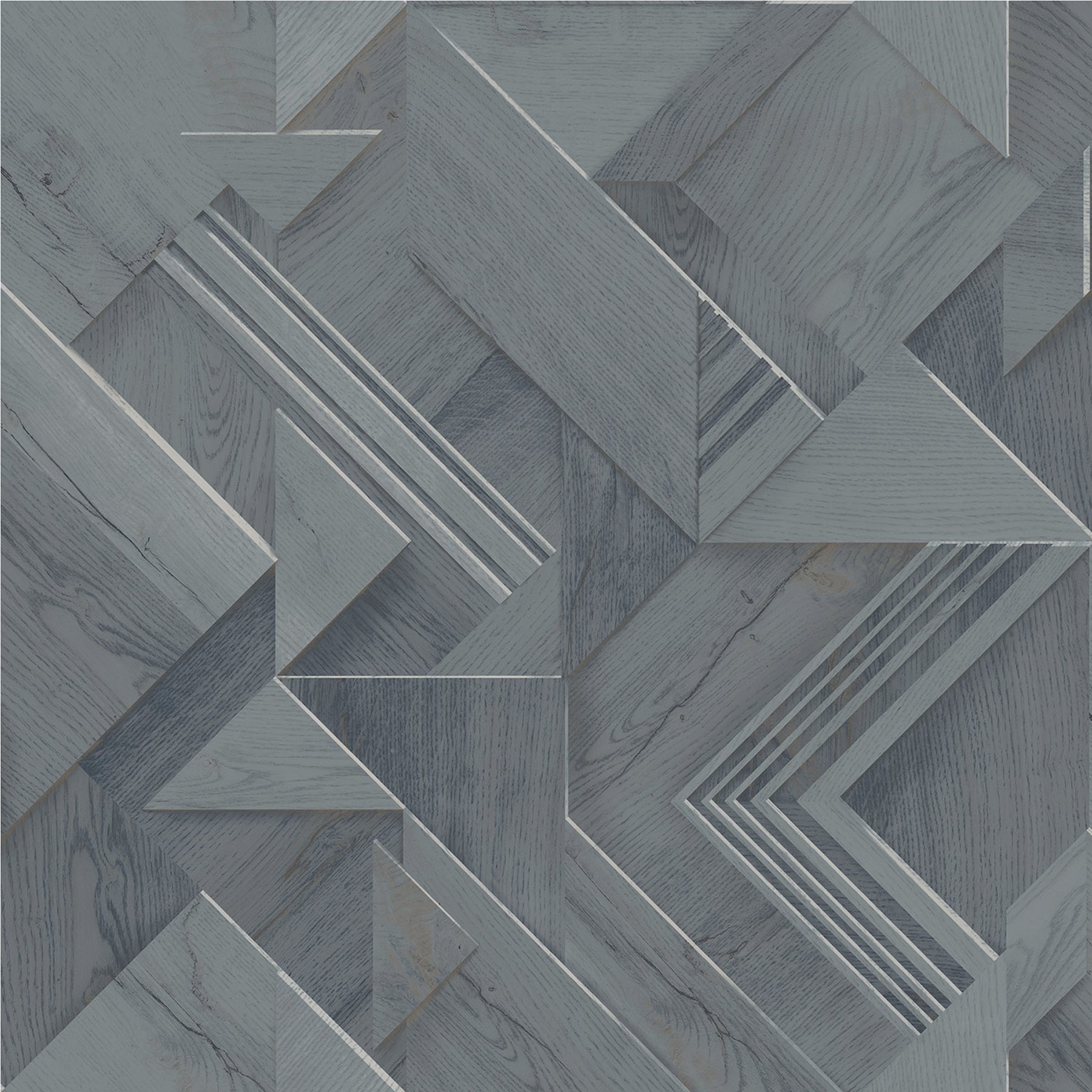Enjoy a moody and modern update to wooden feature wall with this wallpaper. A variety of wooden shapes stained various shades of worn blue are arranged in a chic geometric pattern accented by thin strips of white. Cassian is an unpasted, vinyl on non woven wallpaper.