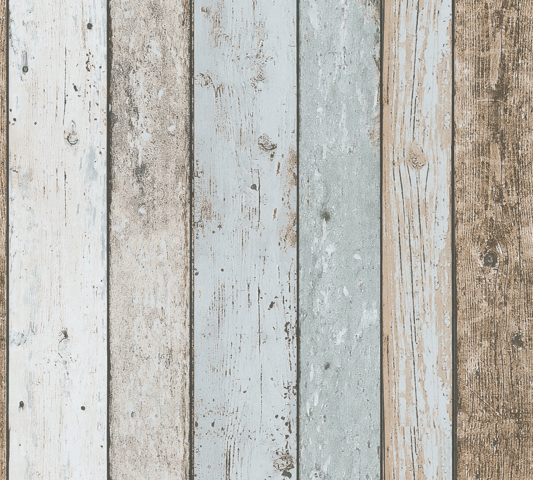 Add coastal or farmhouse charm to your home with this weathered wood plank wallpaper. The strips sport a variety of weathered blues and browns, the woodgrain details softened and worn from the elements. Chapin is an unpasted, paper wallpaper.