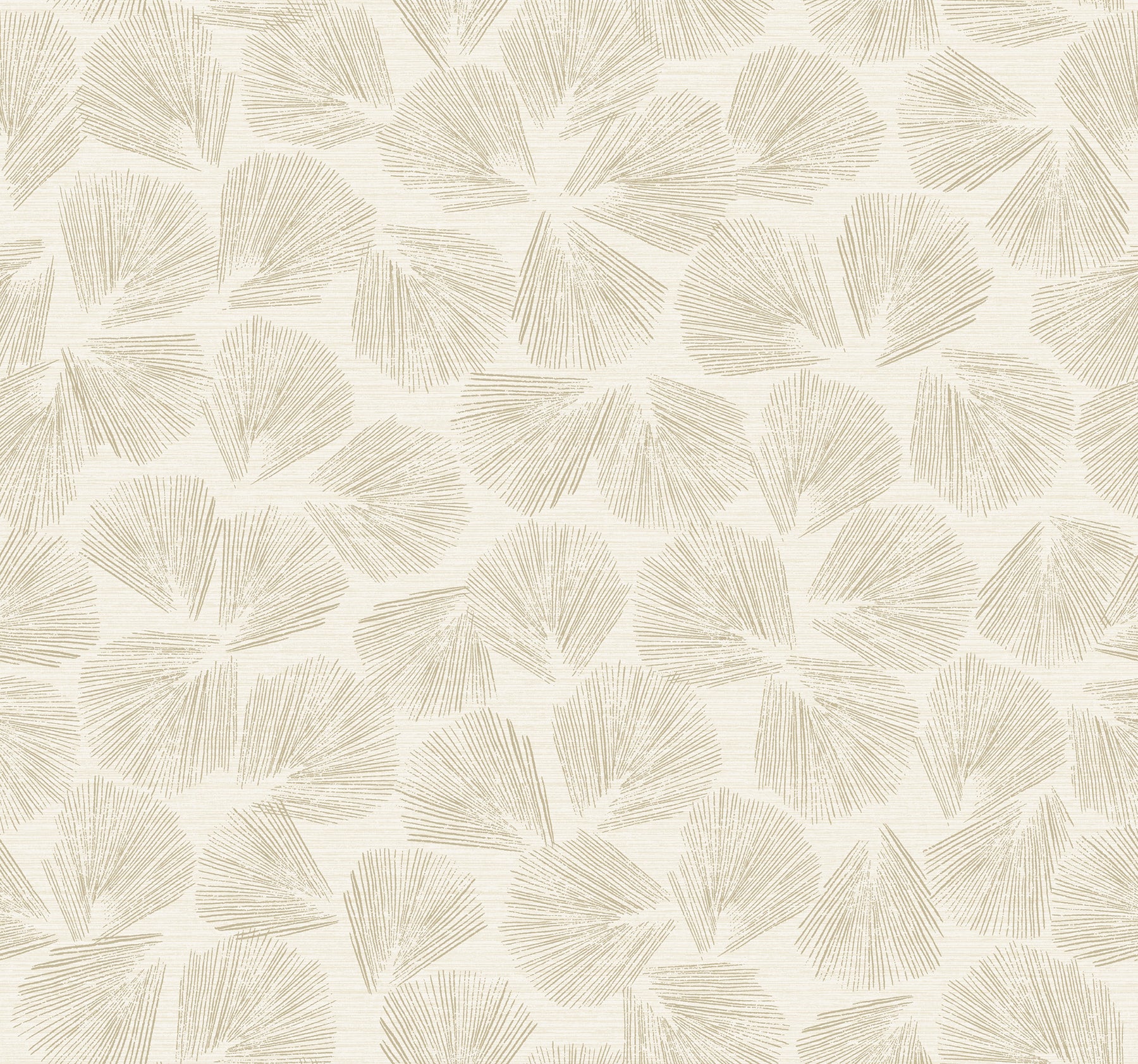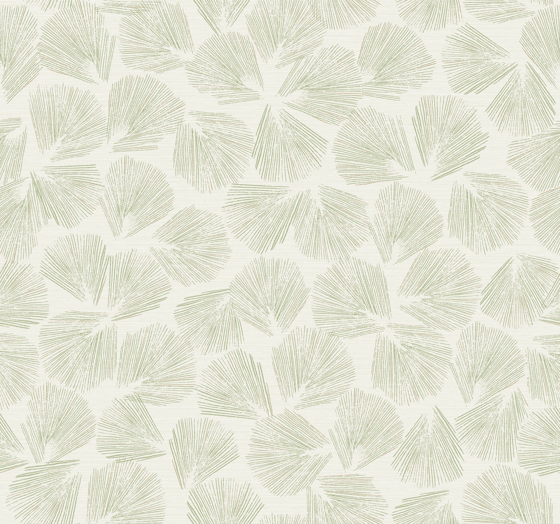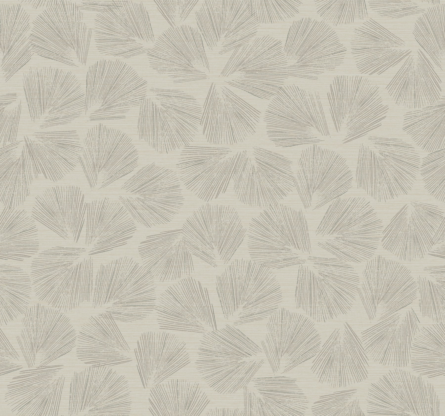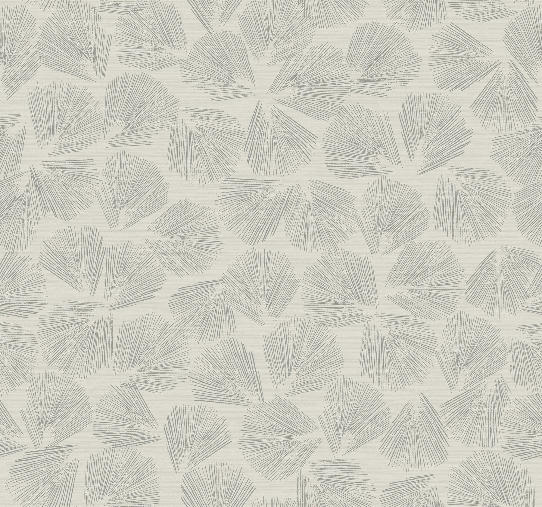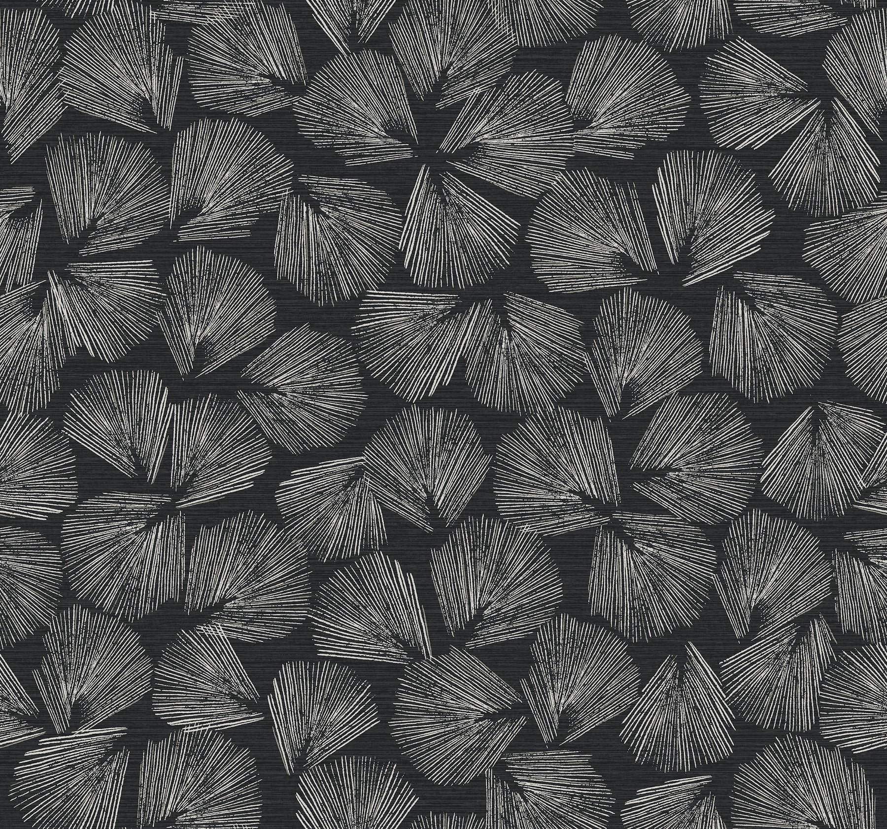 This allover ground cover toss of garden leaves displays Elora Leafís fan shape and raised metallic veining against a backdrop of irregular horizontal lines, shown in onyx black with white. This Elora Leaf Wallpaper measures approximately 27 inches wide by 27 feet long, measuring approximately 60.8 square feet per roll. A retrospective from the private collections of Christiane Lemieux featuring global, artistic, and†handcrafted designs.