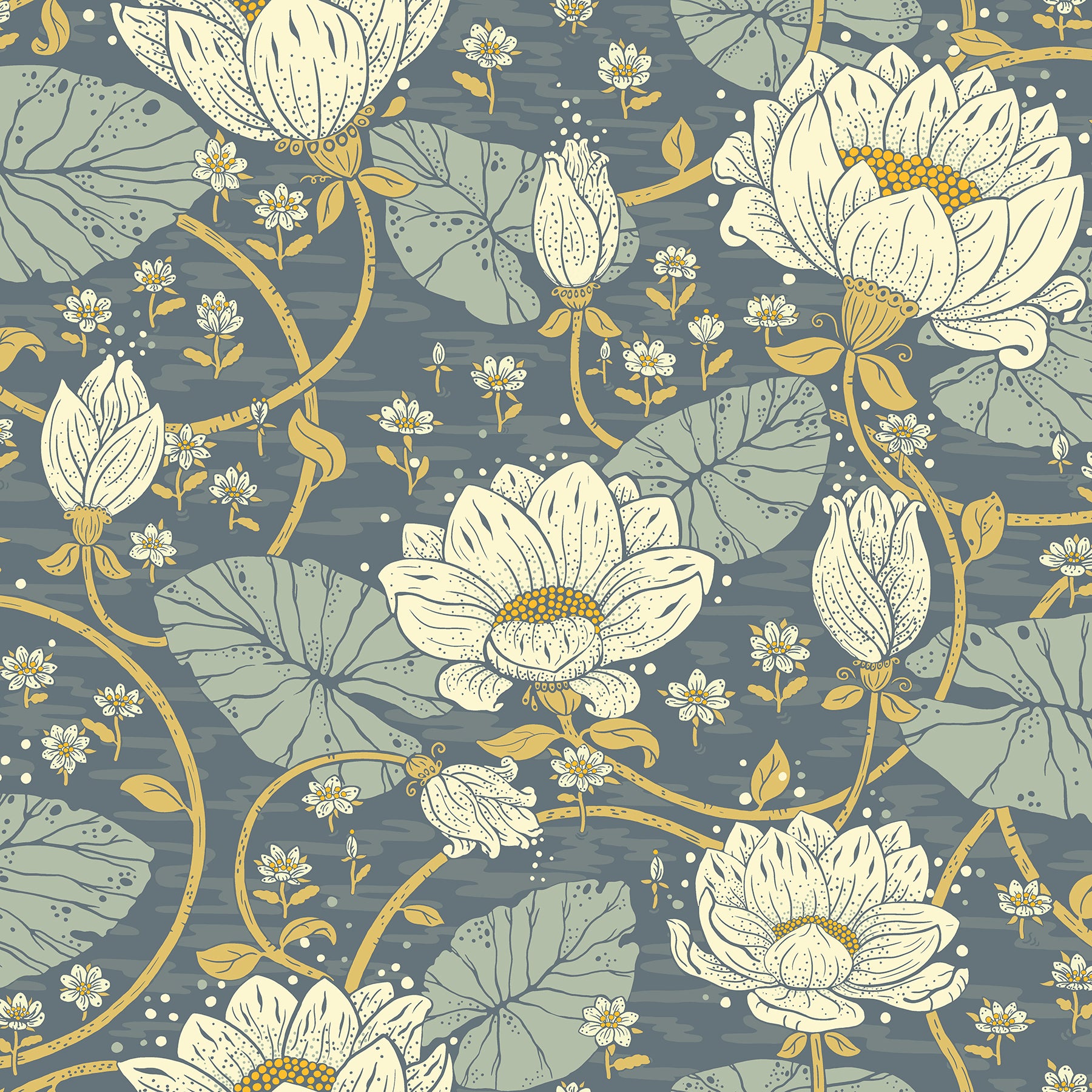 Dreamy and elegant, this lotus flower wallpaper will add a touch of magic to your interiors. The lush, white blooms float atop light yellow lily pads and vines in pale teal waters. Eva Lotus is an unpasted, non woven wallpaper.