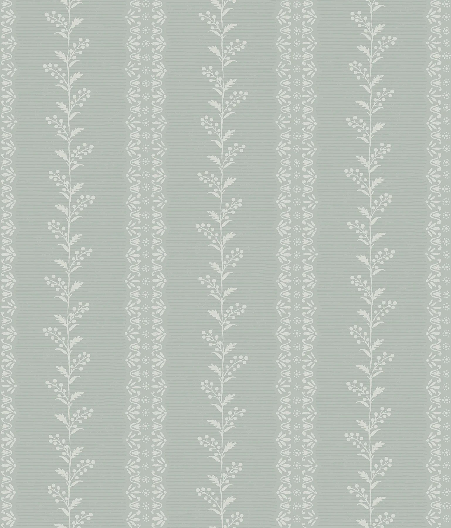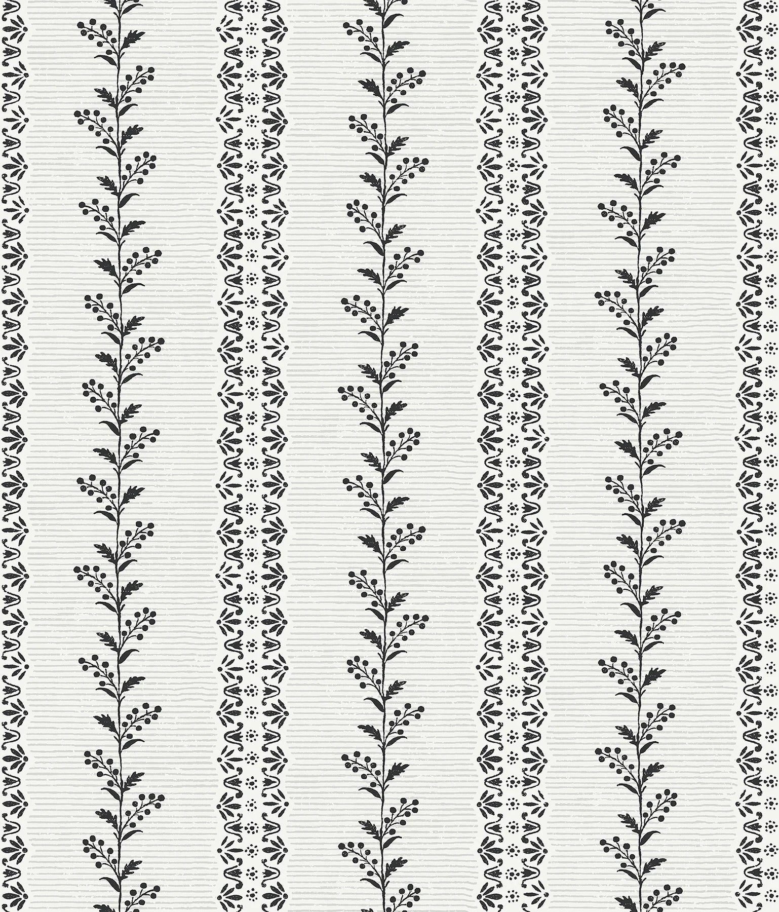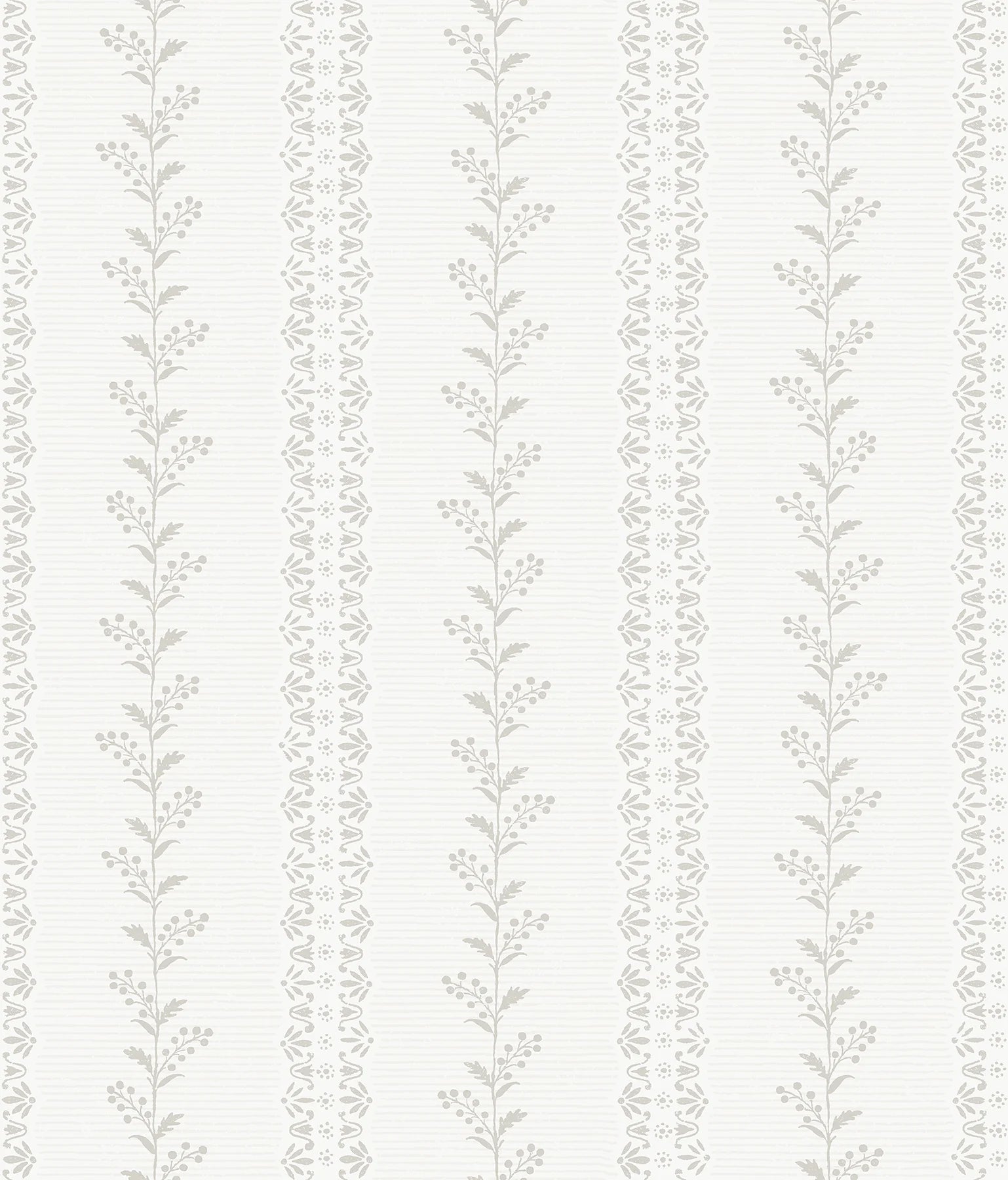 An elevated striped design with nods to nature. Wide columns of delicately lined detailing are overlaid with climbing, berry-laden vines and floral stamps for a scalloped interlude. Featuring a simple palette of grey and white. This Everleigh Wallpaper measures approximately 20.5 inches wide by 33 feet long, measuring approximately 56.4 square feet per roll. This collection of timeless wallcoverings is layered with warmth and charm, and effortlessly blends nostalgic patterns with modern designs.†This assortment has a little bit of everythingósimple stripes, subtle plaids, vintage motifs, and bold florals.