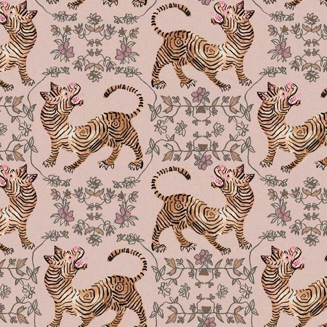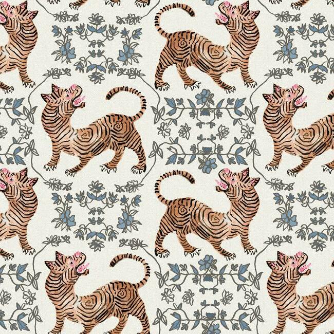 Representative of Yin and Yang, a fierce ambush of Tibetan Tigers prowl through an artisanal landscape strewn with wildflowers in pattern Ferrandi.