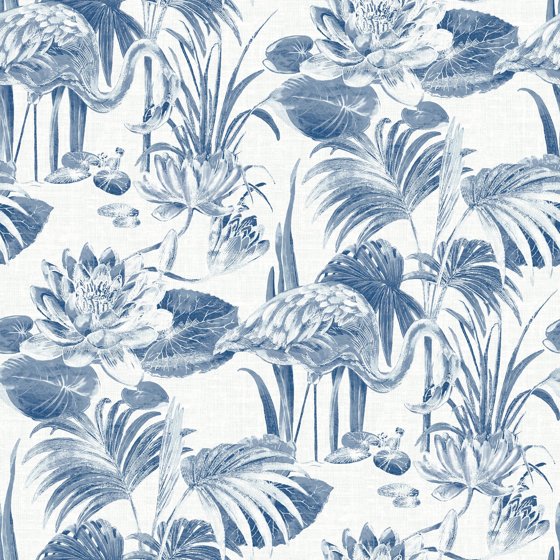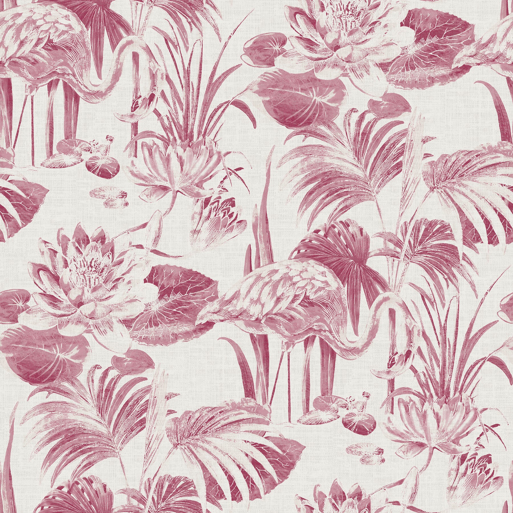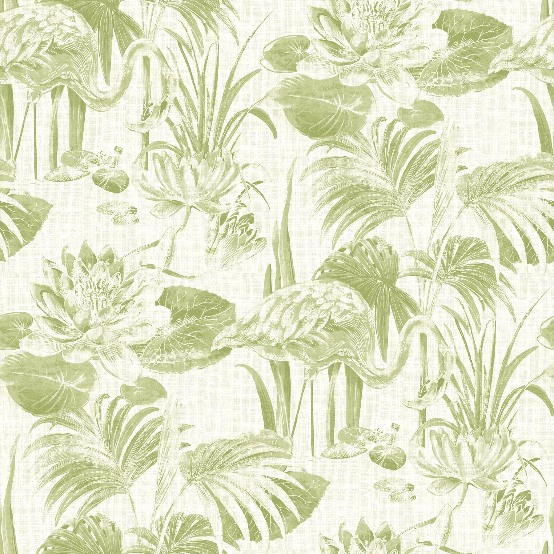Hosted on a linen inspired background, this lagoon scene features elegant flamingos, water lilies and palm fronds. Its hand painted style is reminiscent of an antique watercolor. Frolic is an unpasted, non woven wallpaper.