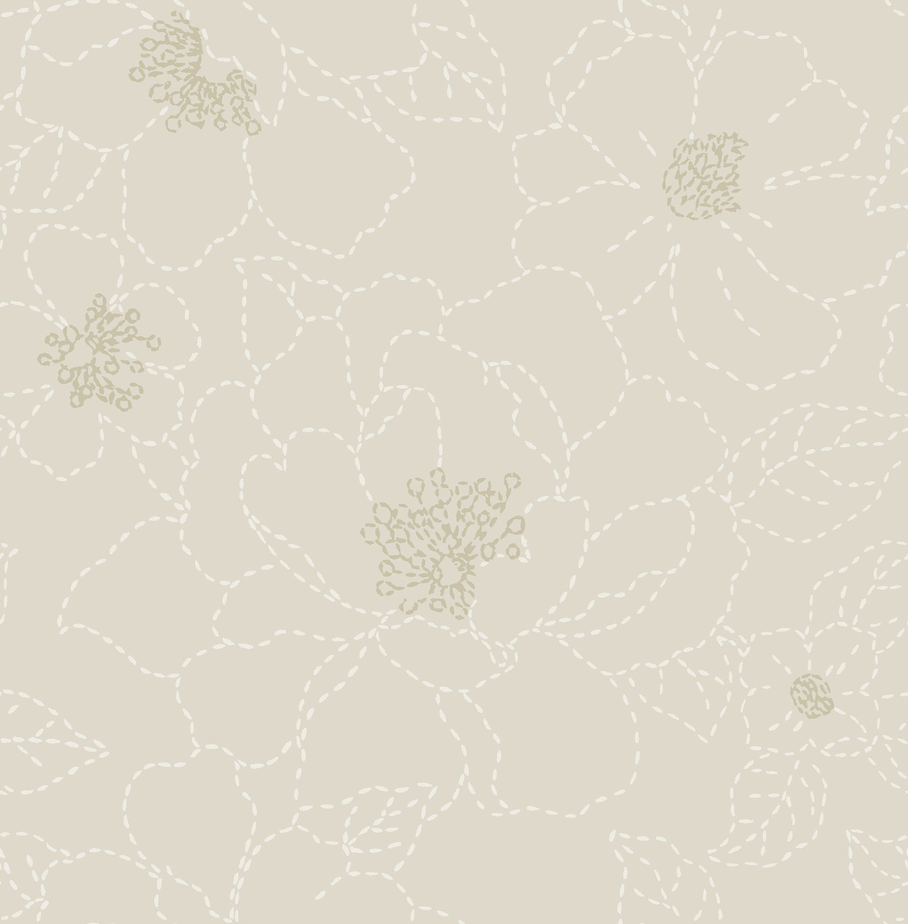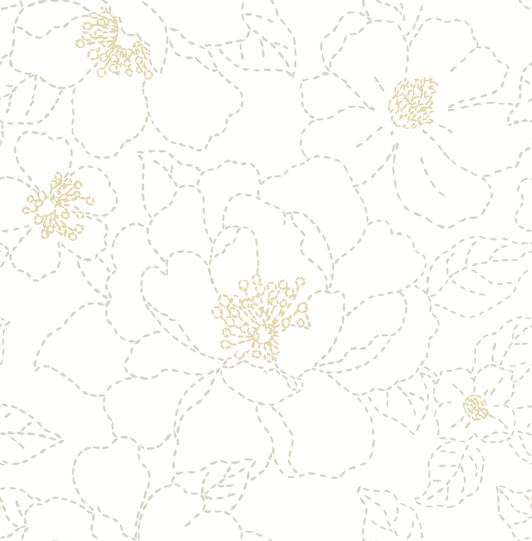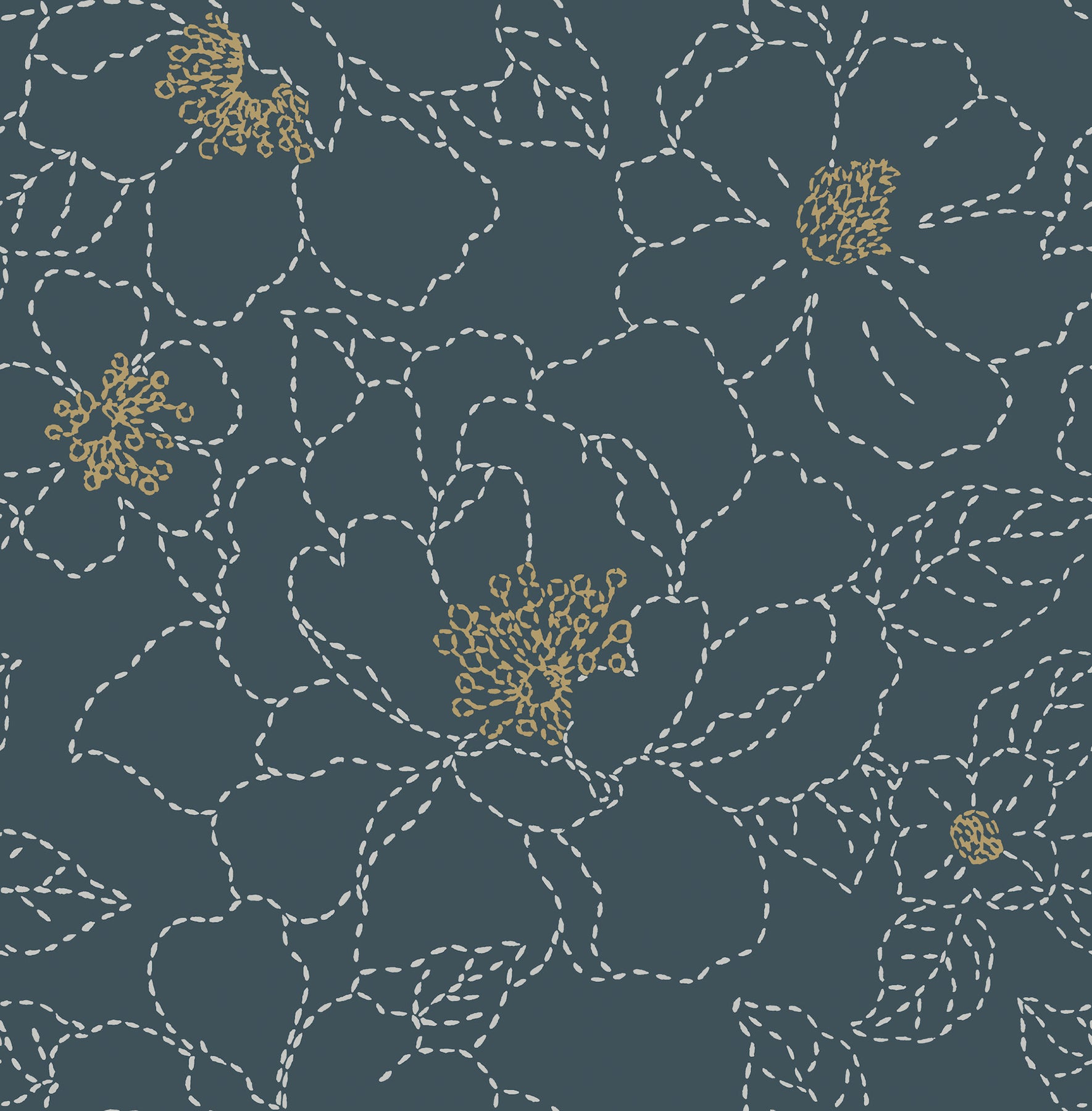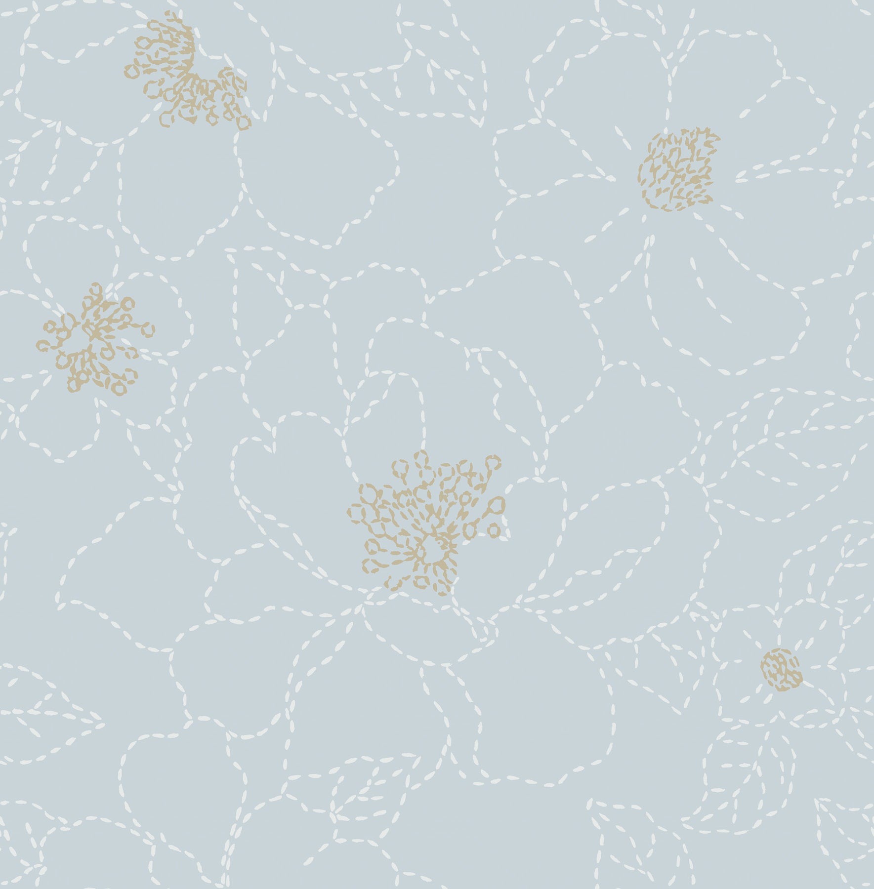 Add simple, feminine charm to your interiors with this floral design. The blossoms are outlined in white stitching against a pale, blue-green backdrop, the centers of the flowers embellished with metallic gold. Gardena is an unpasted, non woven wallpaper measuring 20.5 inches wide by 33 feet long, covering approximately 56.4 square feet per roll.