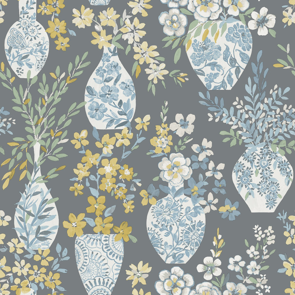 This inviting, artistically styled floral design will add instant feminine charm to your walls. The blue and white ceramic vases are filled with an array of pink, coral, goldenrod, white, and blue blooms, all richly offset by a forest green backdrop. Harper is an unpasted, non woven wallpaper.