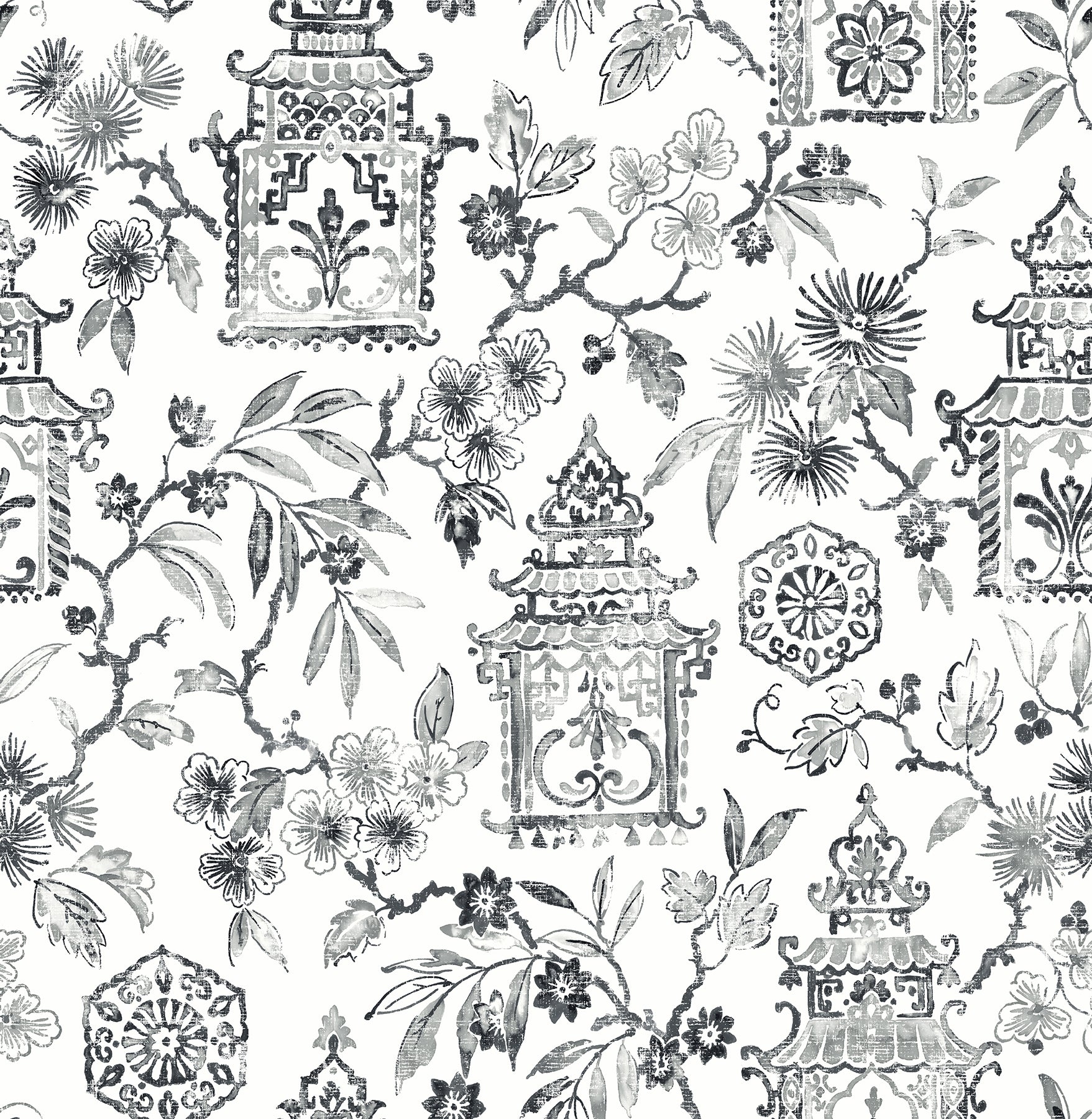 Bring playful sophistication to your walls with this chinoiserie-inspired design! This toile wallpaper features petite pagodas, floral medallions, and blossoming fruit tree branches, all inked in shades against soft white. Helaine is an unpasted, non woven wallpaper.