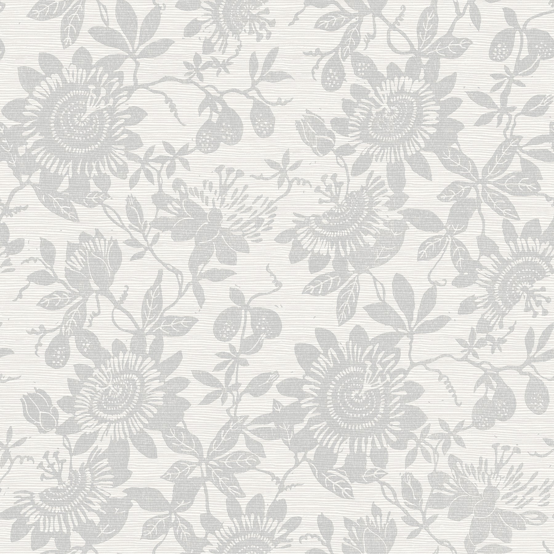 This modern take on Jacobean wallpaper features layers of luxurious detail. The bright floral trails twine along a white backdrop finished with both a ridged texture and pearlescent shine. Helen is an unpasted, non woven wallpaper.