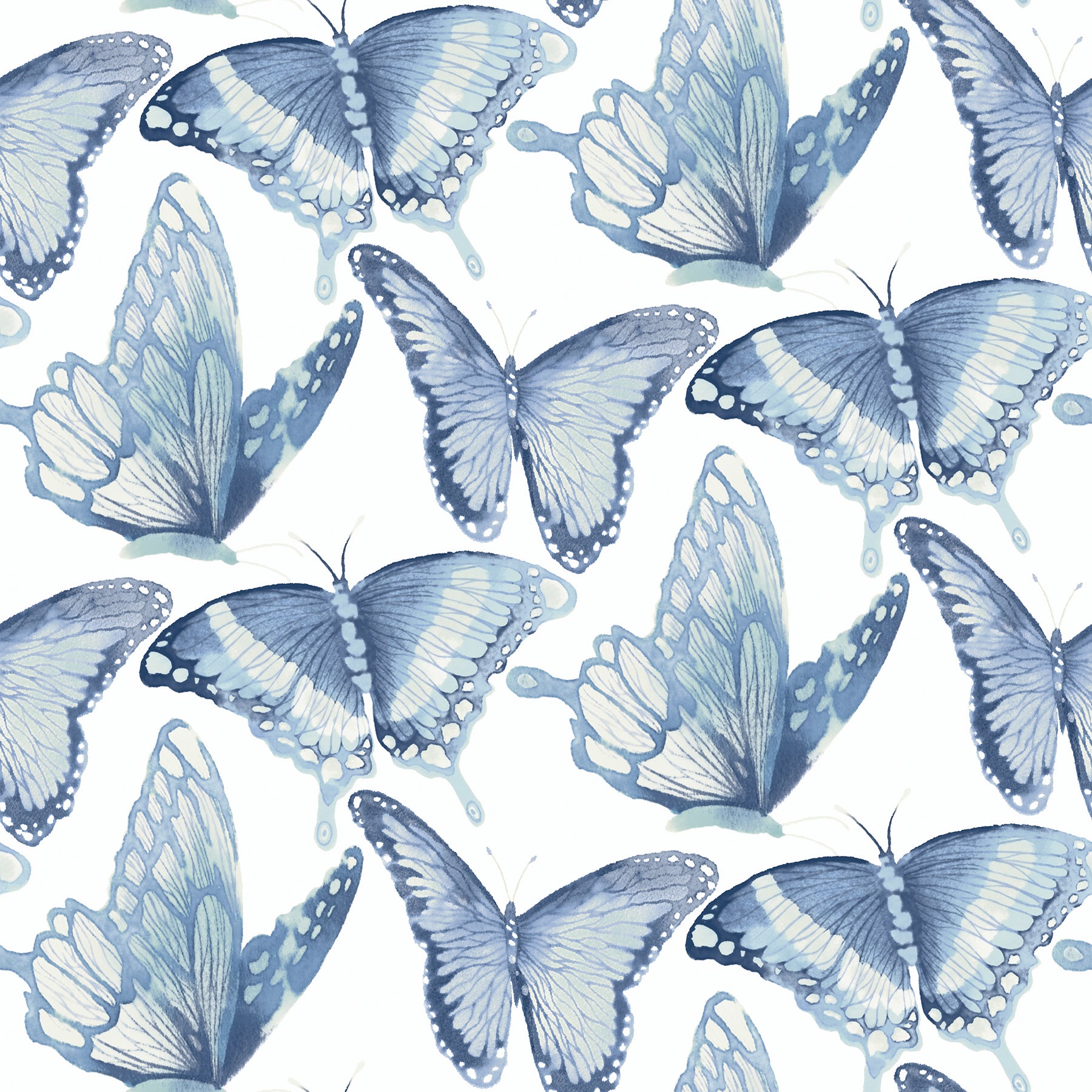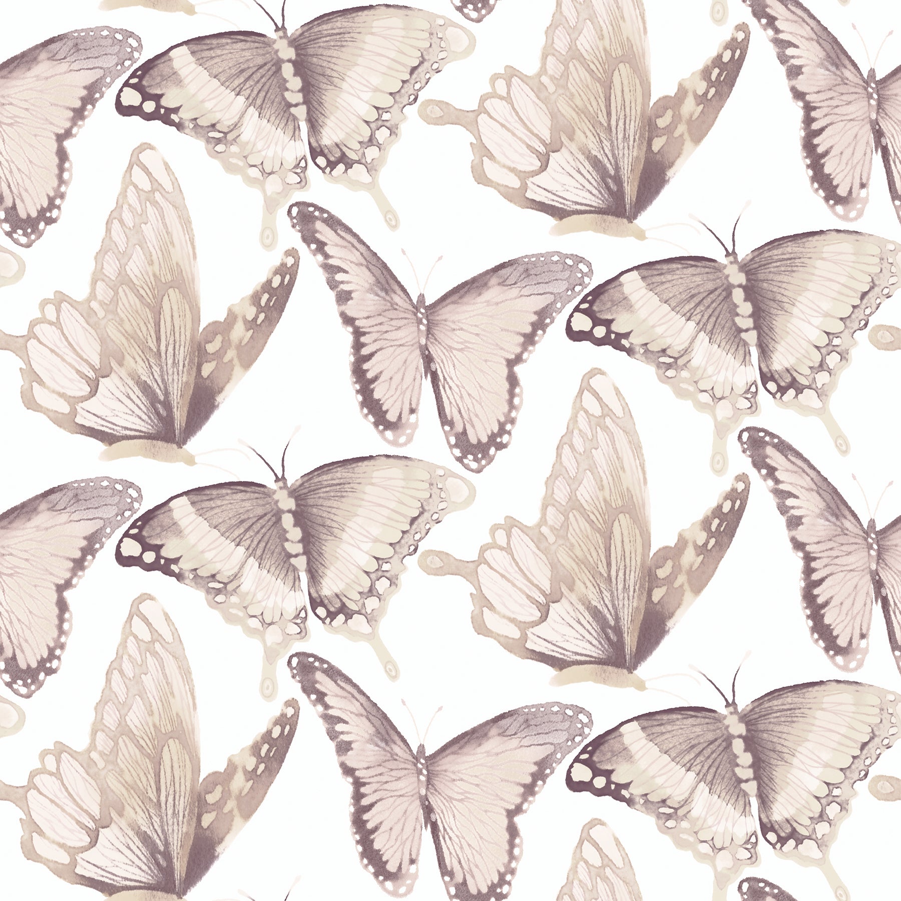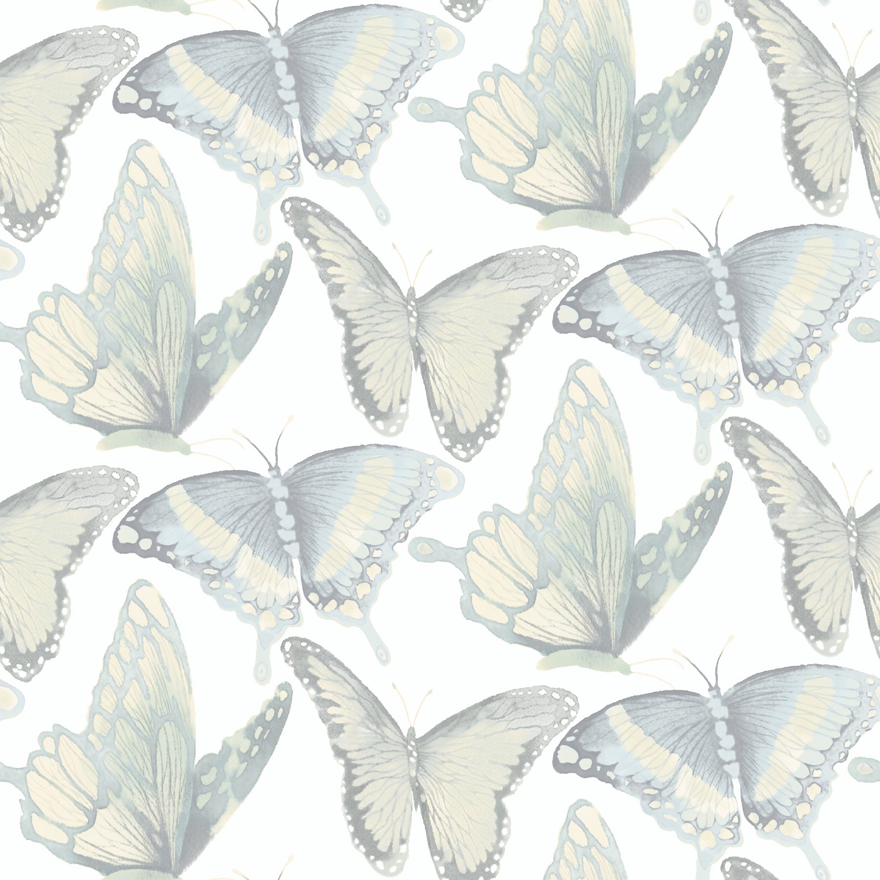 Give your walls a whimsical touch of enchantment with this gorgeous watercolor print. Hand-painted in gentle grey hues, monarch and swallowtail butterflies flutter across a crisp white backdrop. Janetta is a prepasted, non woven blend wallpaper.