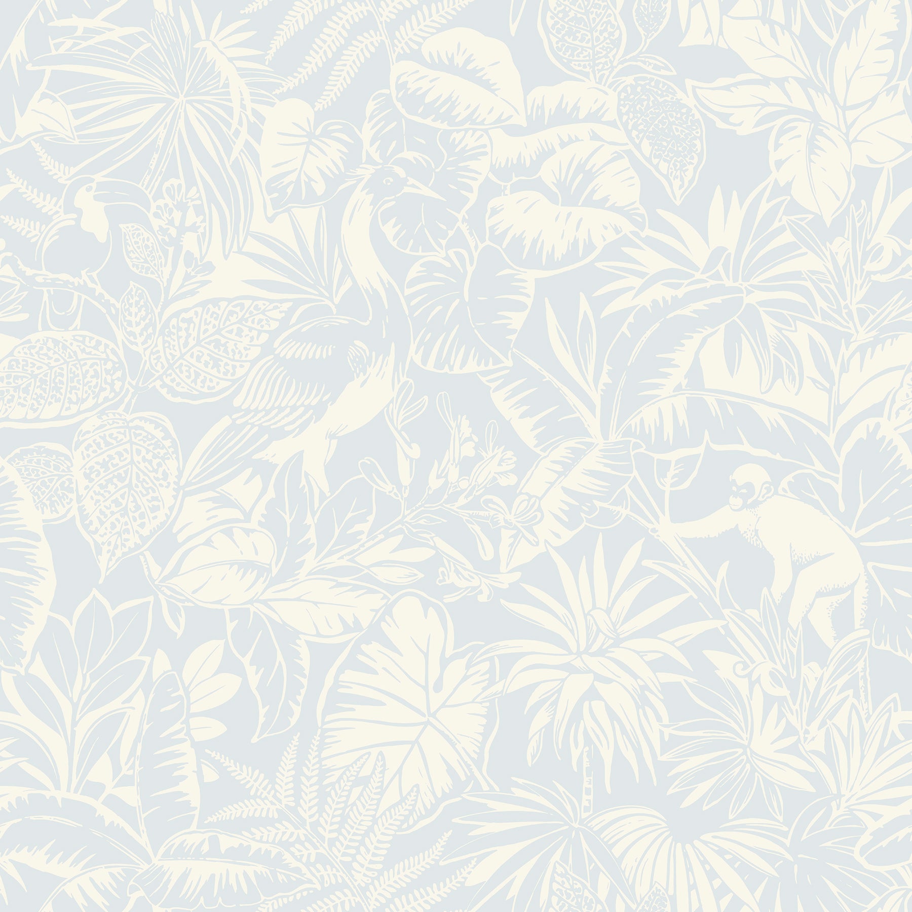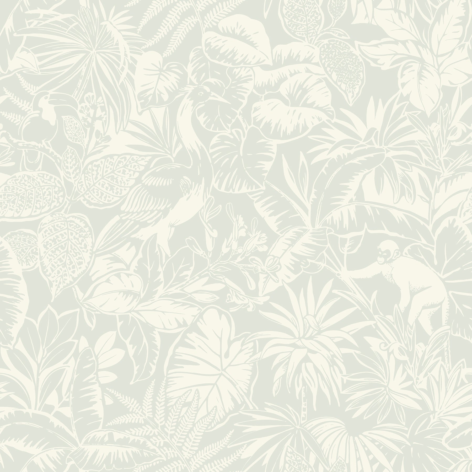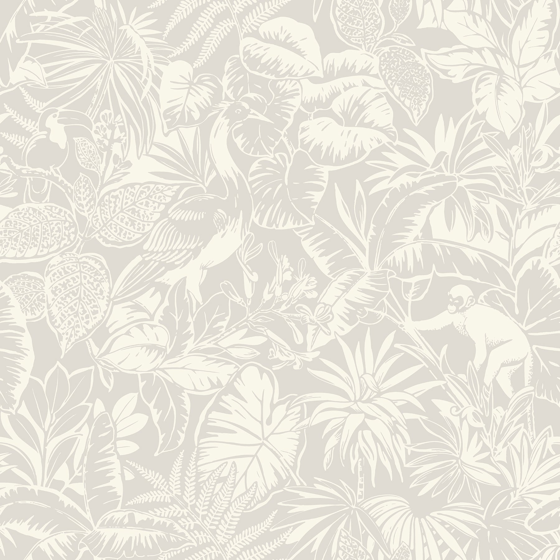 Enjoy a lush, tropical retreat with this timeless yet playful print. Monkeys cavort while cranes strut and toucans perch among the rainforest greenery, the details inked in white against a coral-pink backdrop. Corcovado is a prepasted, sure strip wallpaper.