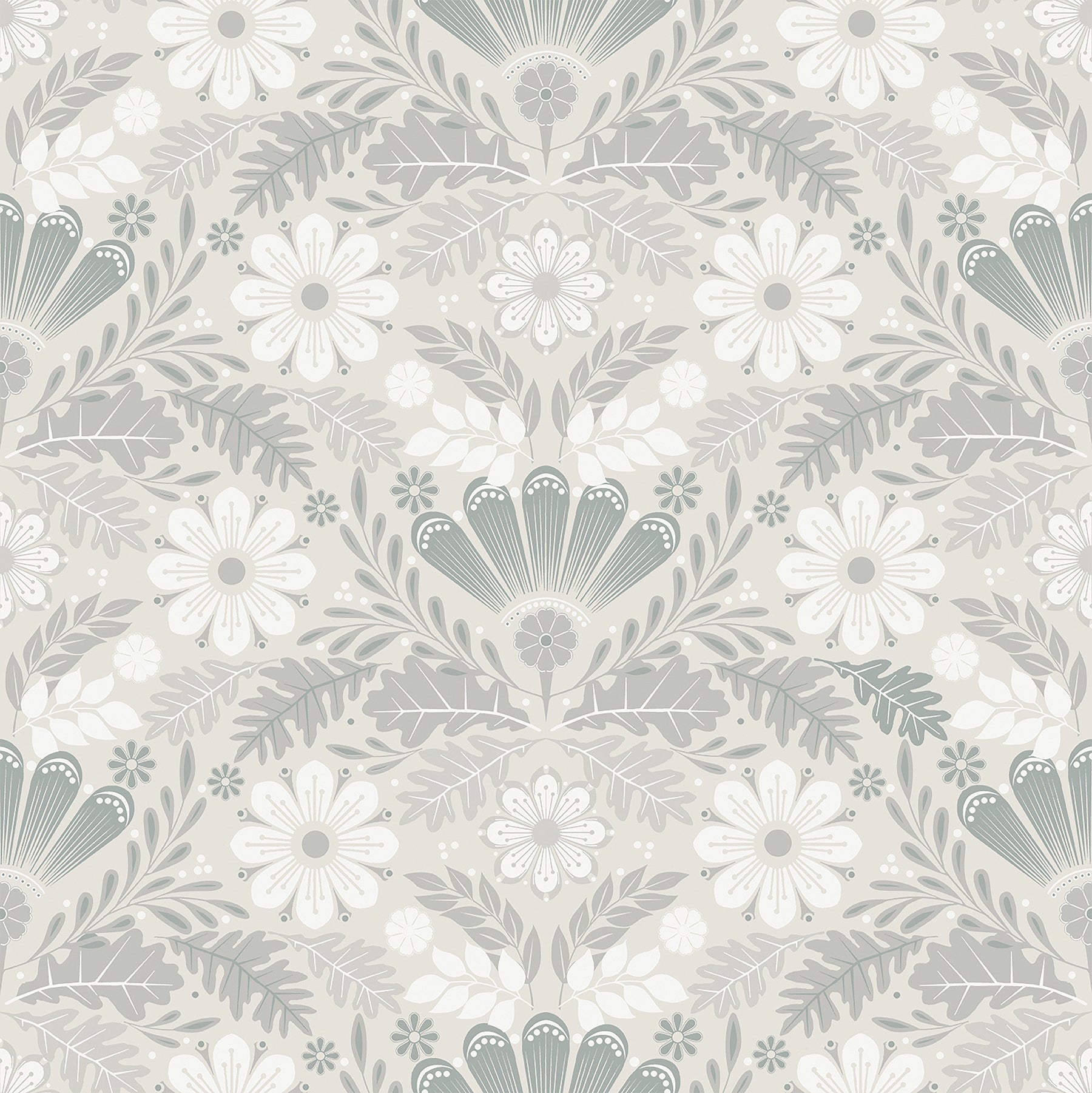 This striking botanical design brings a sophisticated charm to your walls. The damask features an ornate, fan-like crown, leafy boughs and oak leaves, and stylized flowers; the neutral palette adds to its stately allure. Klockrike is an unpasted, non woven wallpaper.