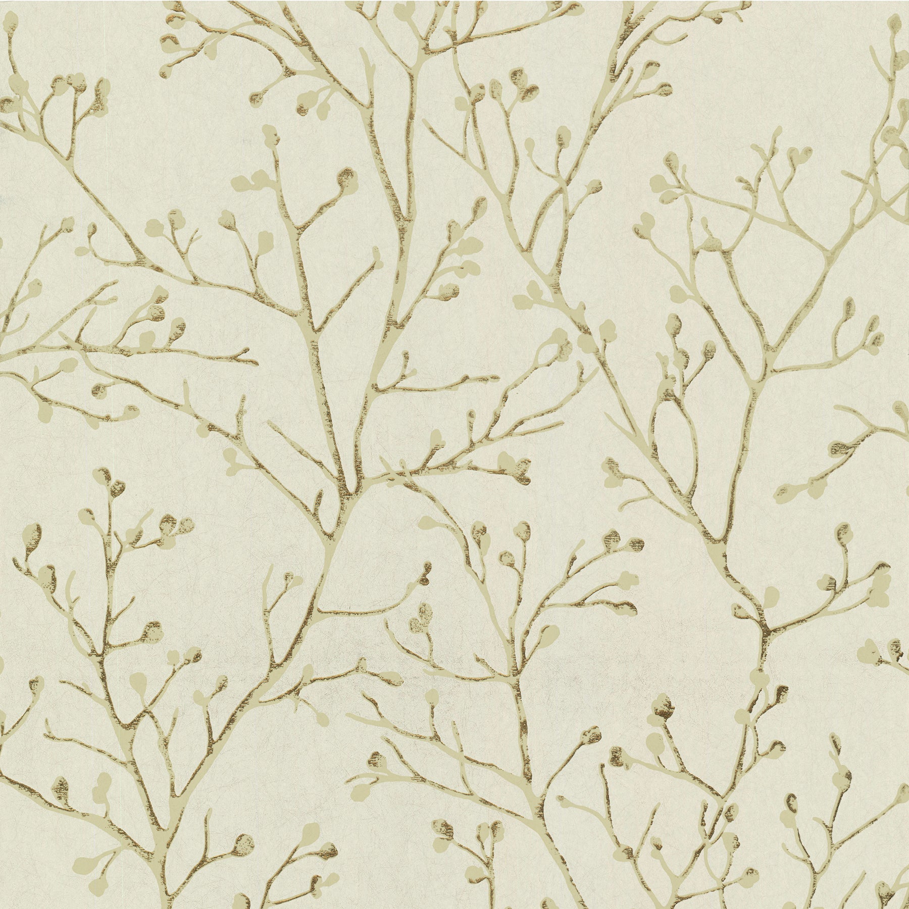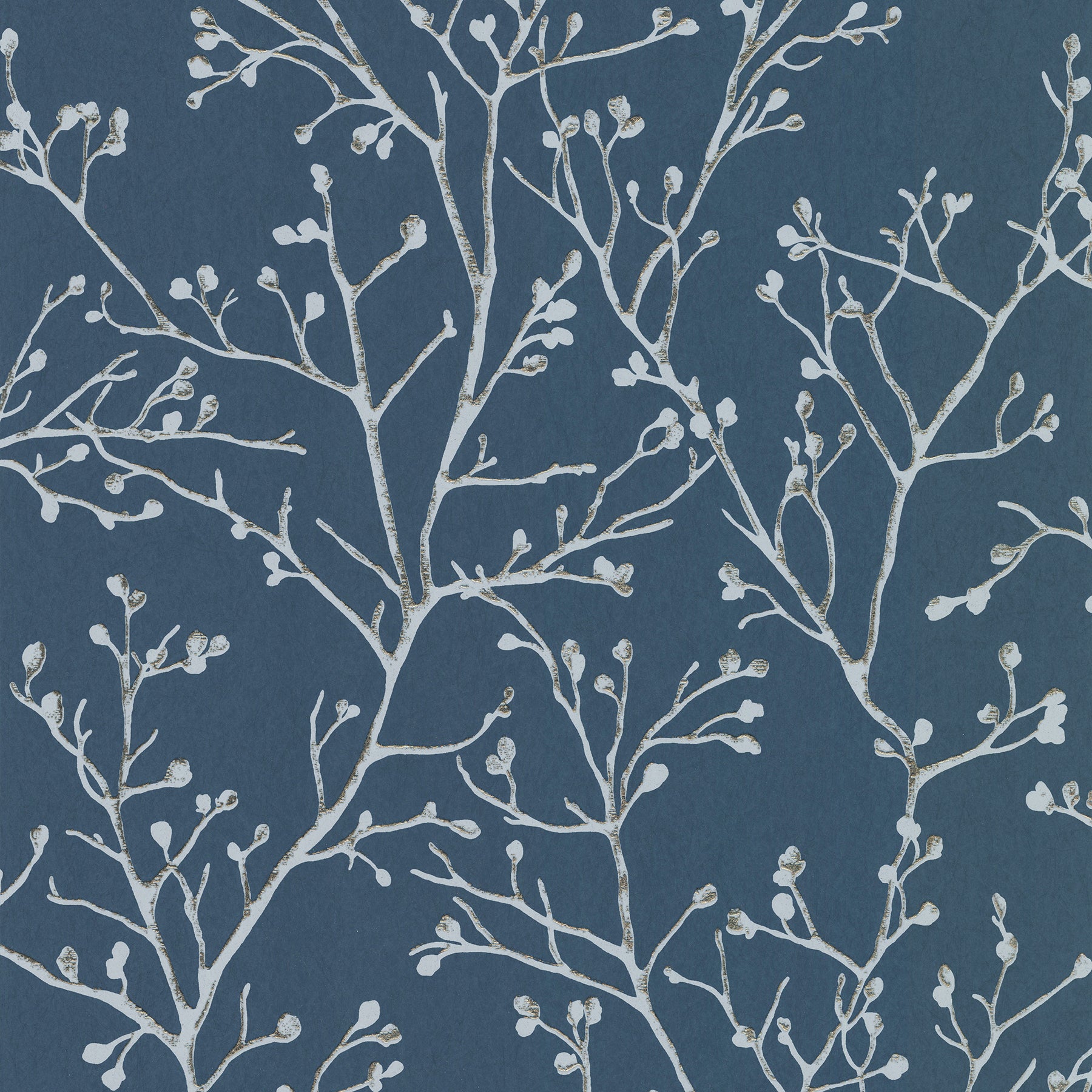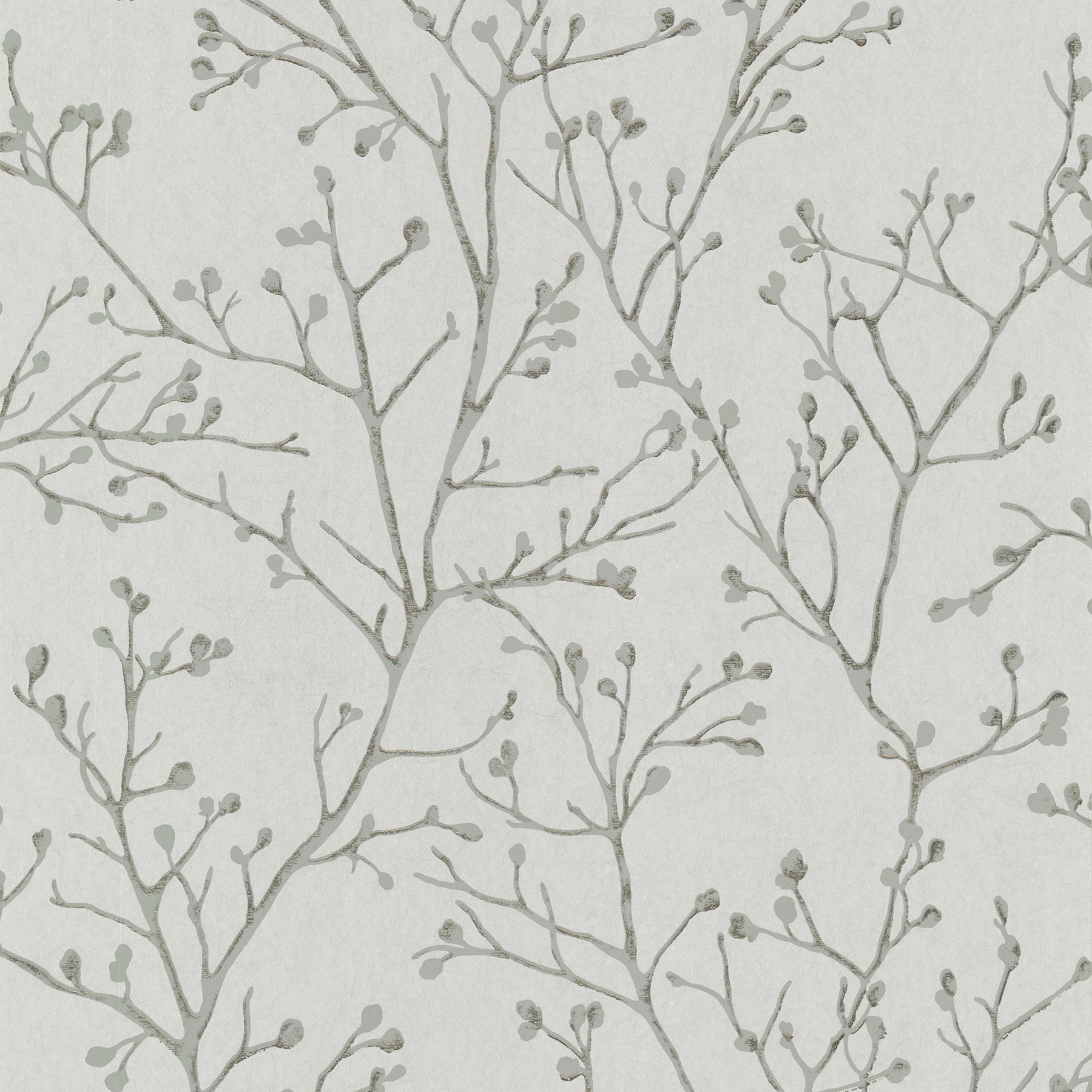 This delicate botanical design brings classic elegance to your home. A light grey backdrop is overlaid with spindly grey branches accented with springtime buds and metallic silver highlights. Koura is an unpasted, foil on non woven wallpaper.