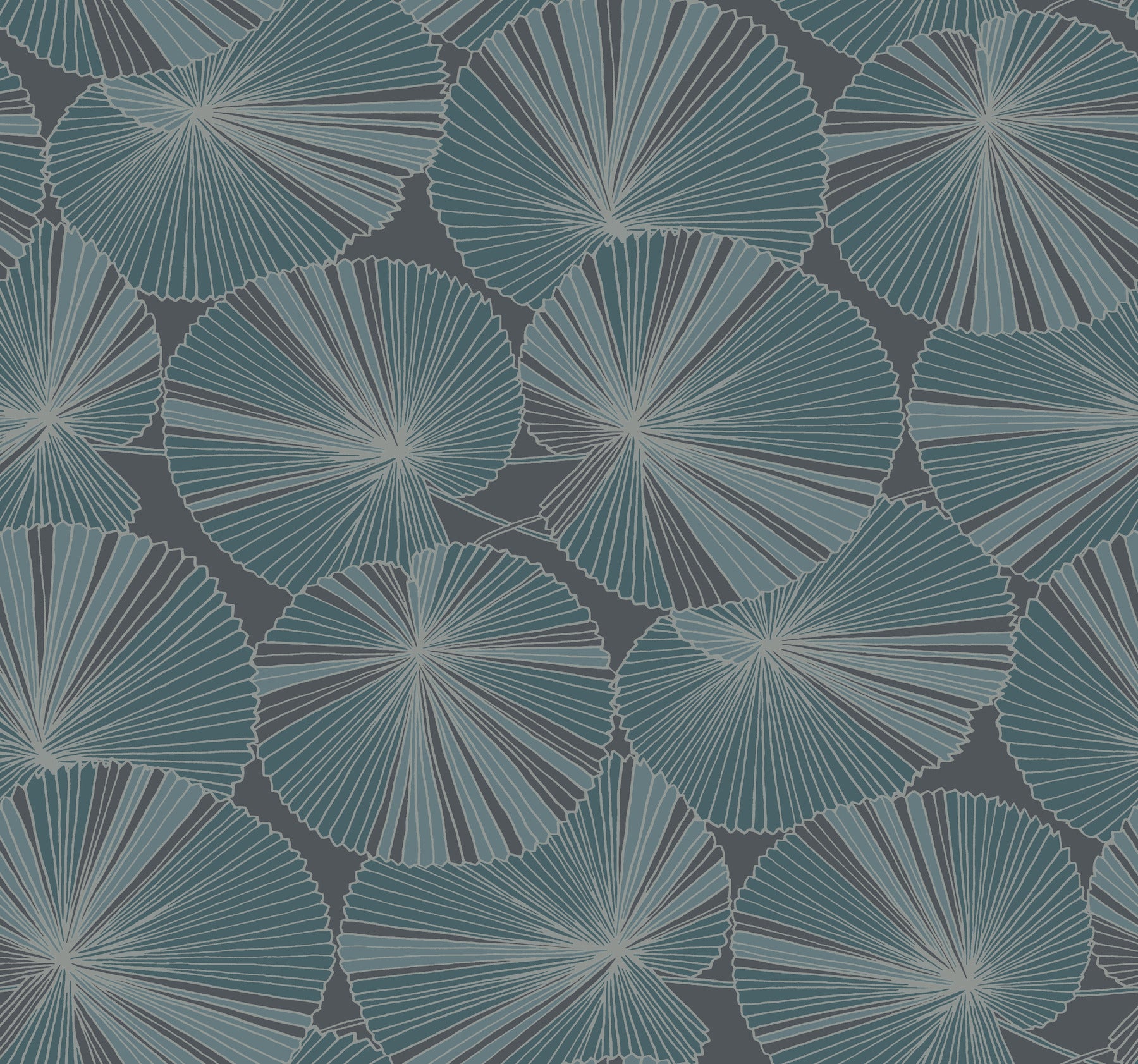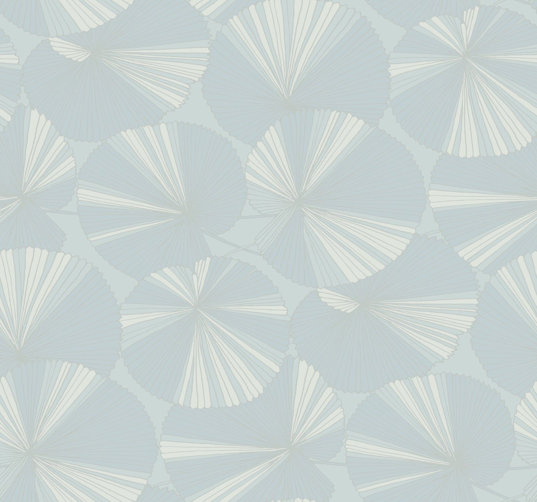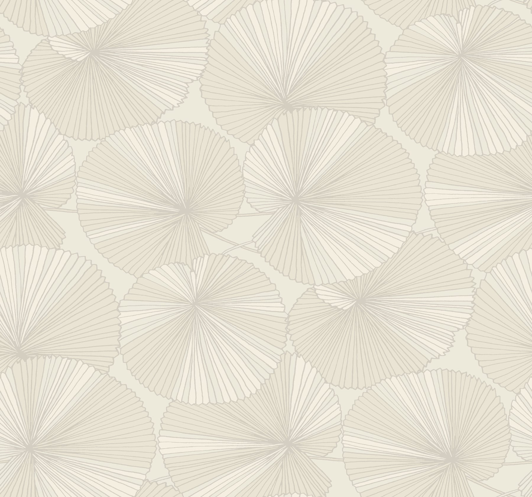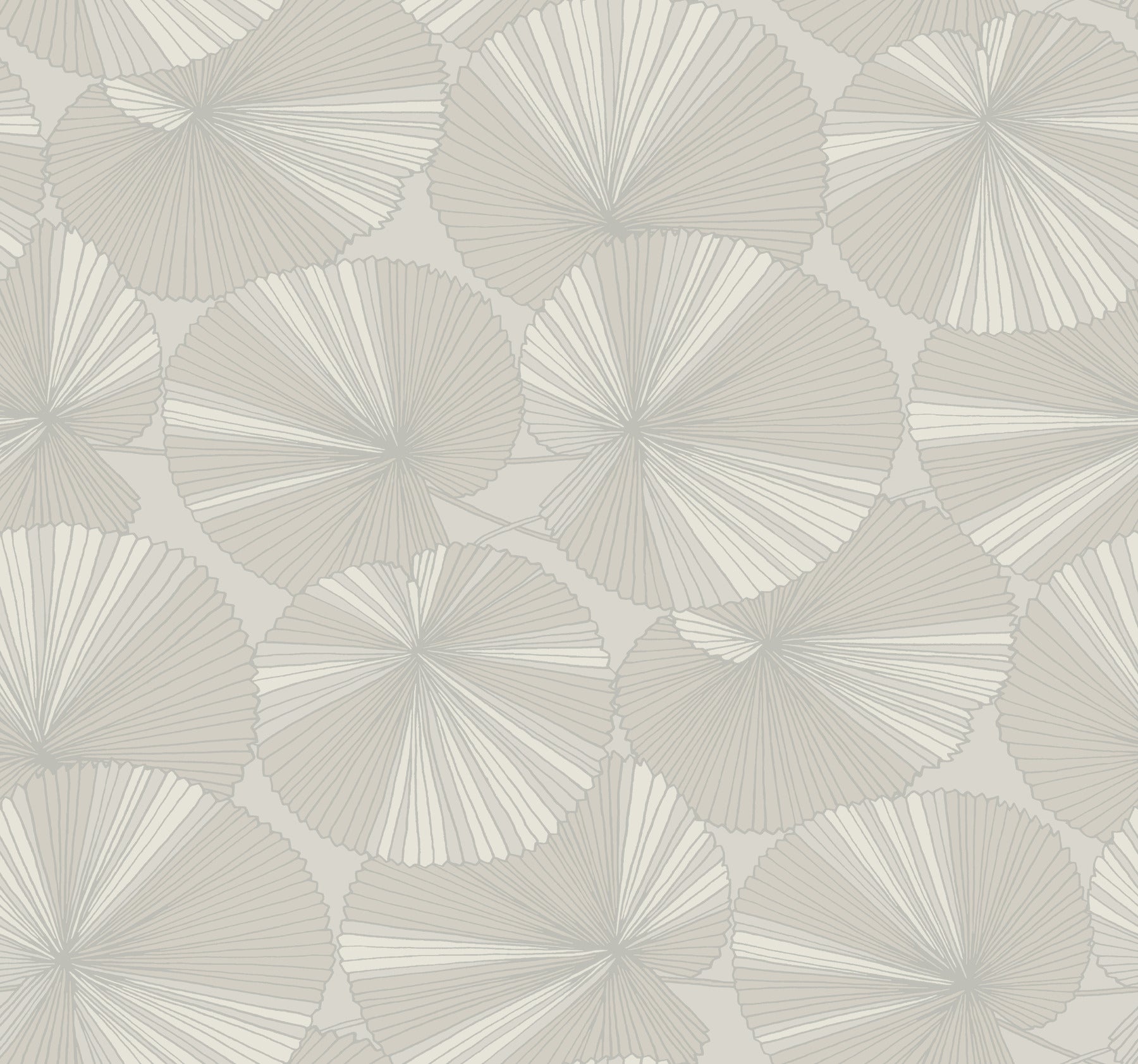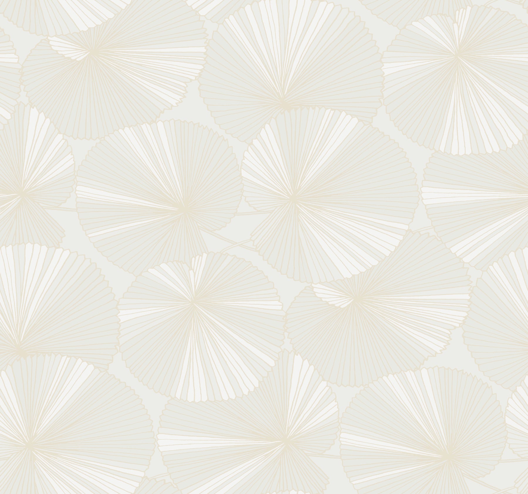 The circular leaves of this flowering aquatic herb emerge and float across the stillness of the water's surface in the pattern Layered Lily Pads, shown in cream white with taupe grey. This Layered Lily Pads Wallpaper measures approximately 27 inches wide by 27 feet long, measuring approximately 60.8 square feet per roll. Finding beauty in this extraordinary organic world.