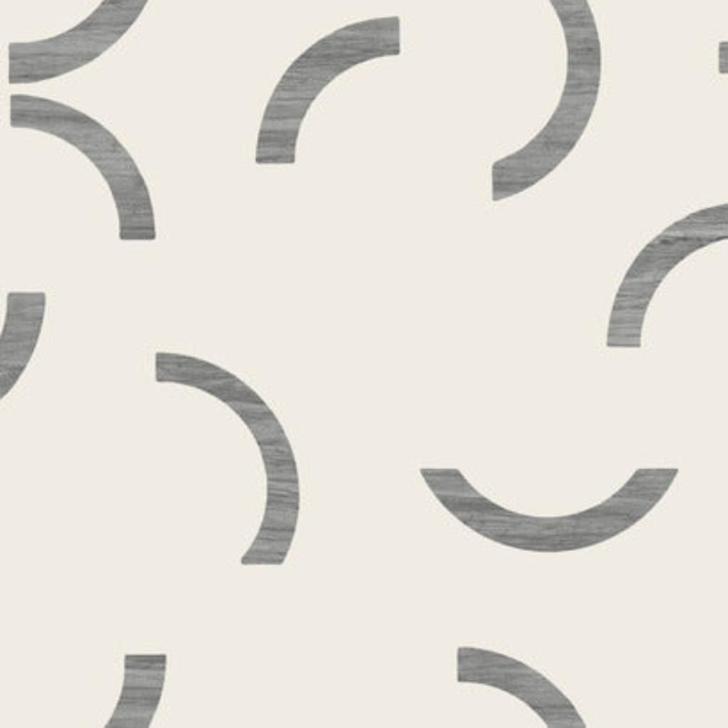 This modern geometric design features a variety of thin crescents embellished with striated layers of monotone color with a cream background.
