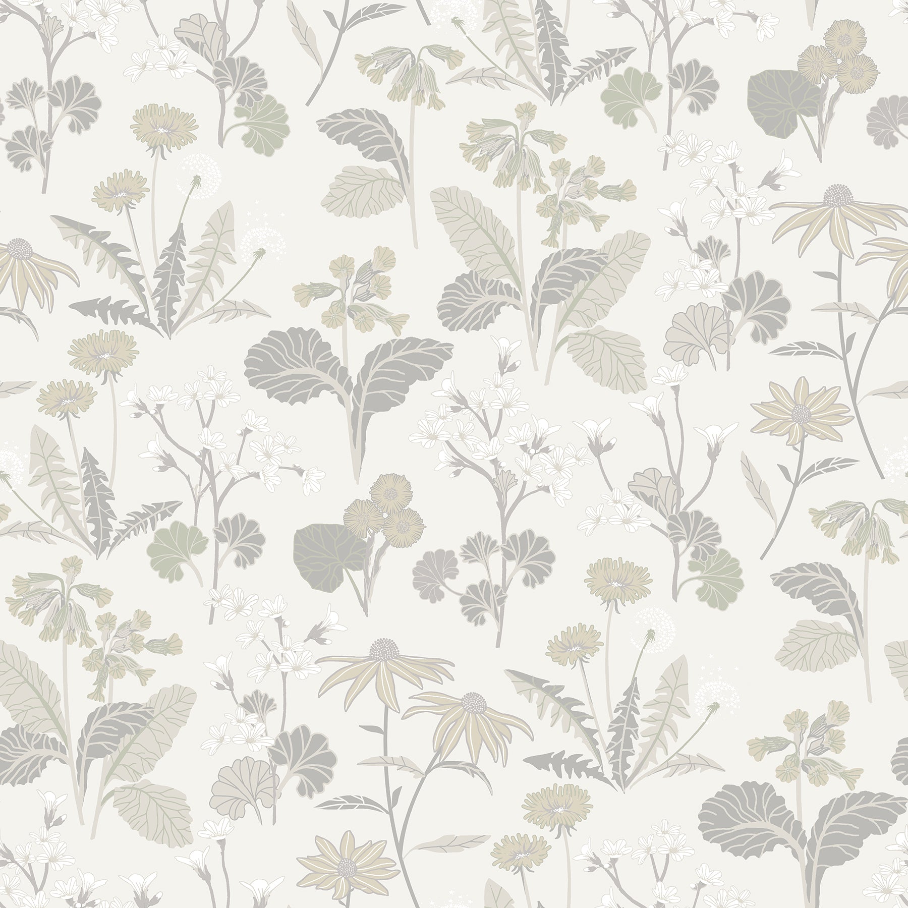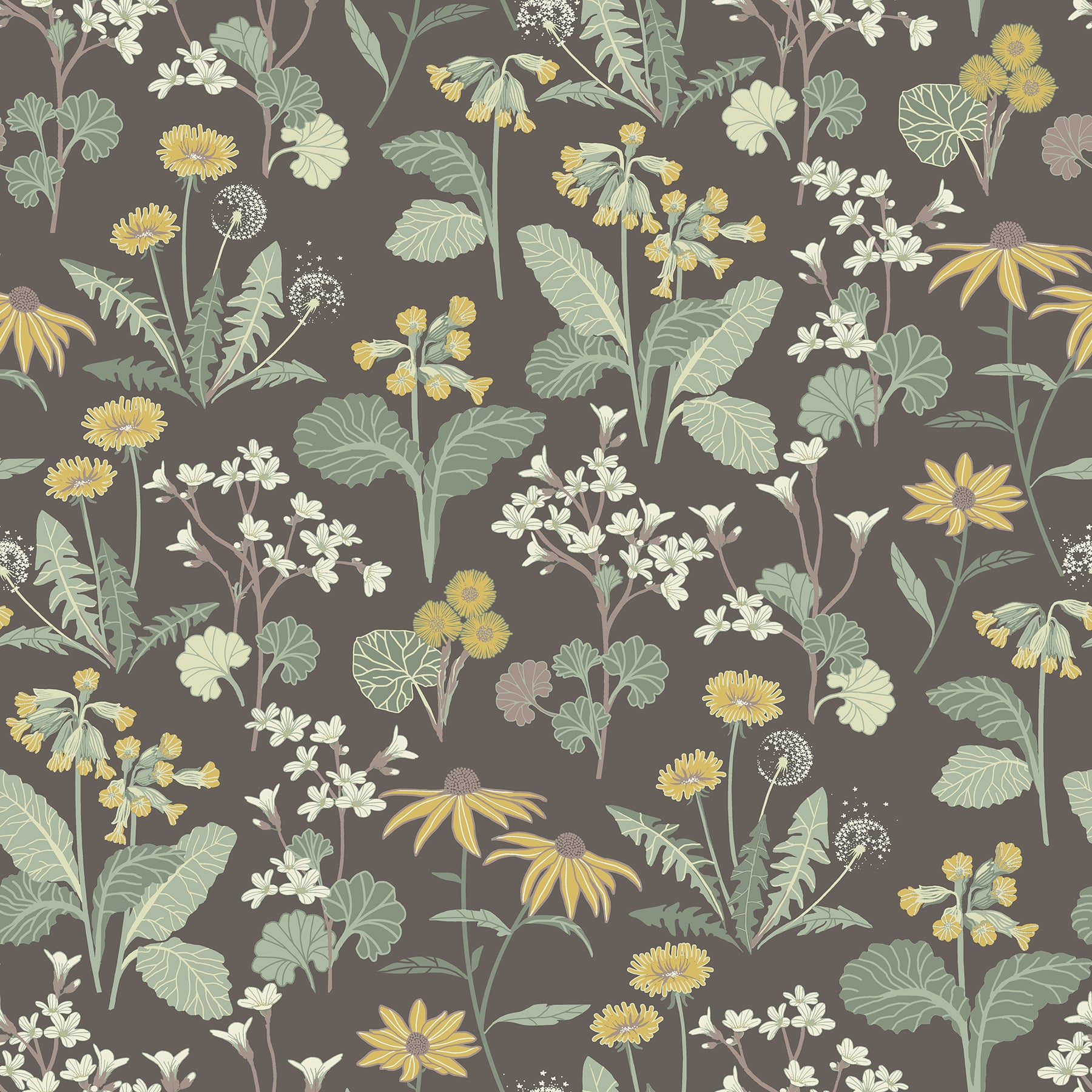This charming floral wallpaper puts the spotlight on backyard blooms often overlooked! Dandelions, black-eyed susans and other wild blossoms are illustrated in gold, green, and white against a charcoal backdrop. Magdalena is an unpasted, non woven wallpaper.