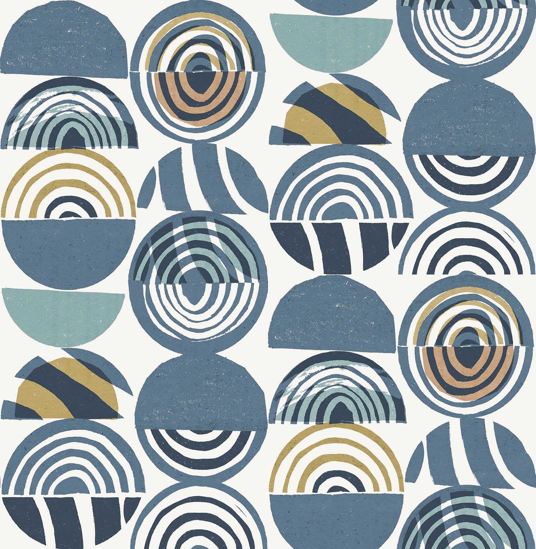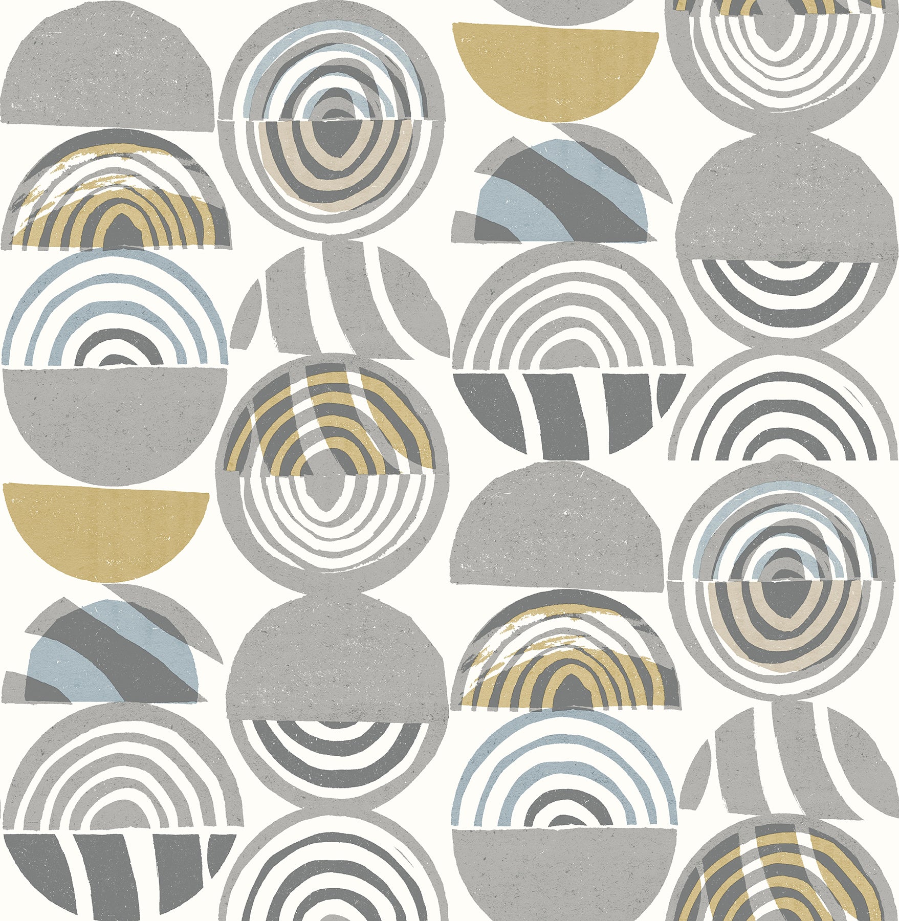 Enjoy a perfect marriage of modern and retro flair with this geometric wallpaper. The stone grey circles are embellished with swirled designs, with touches of teal and ochre adding a pop of color to the pattern. Mage is an unpasted, non woven wallpaper.