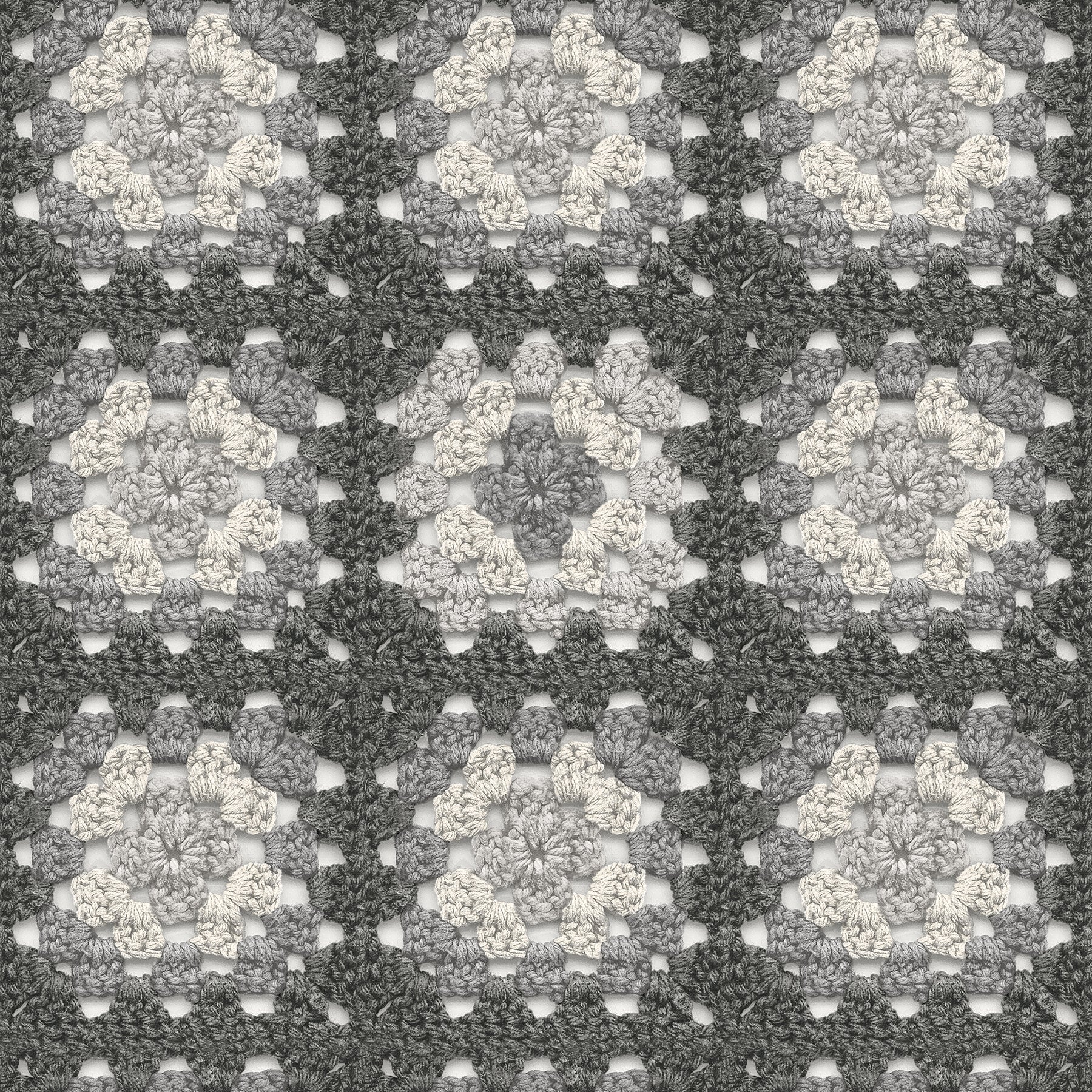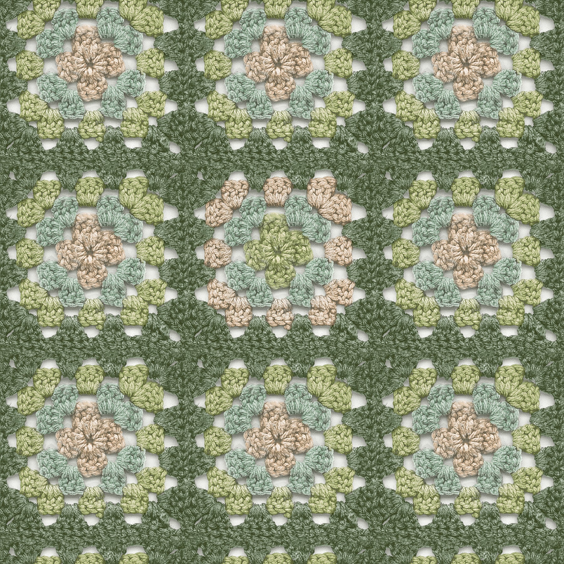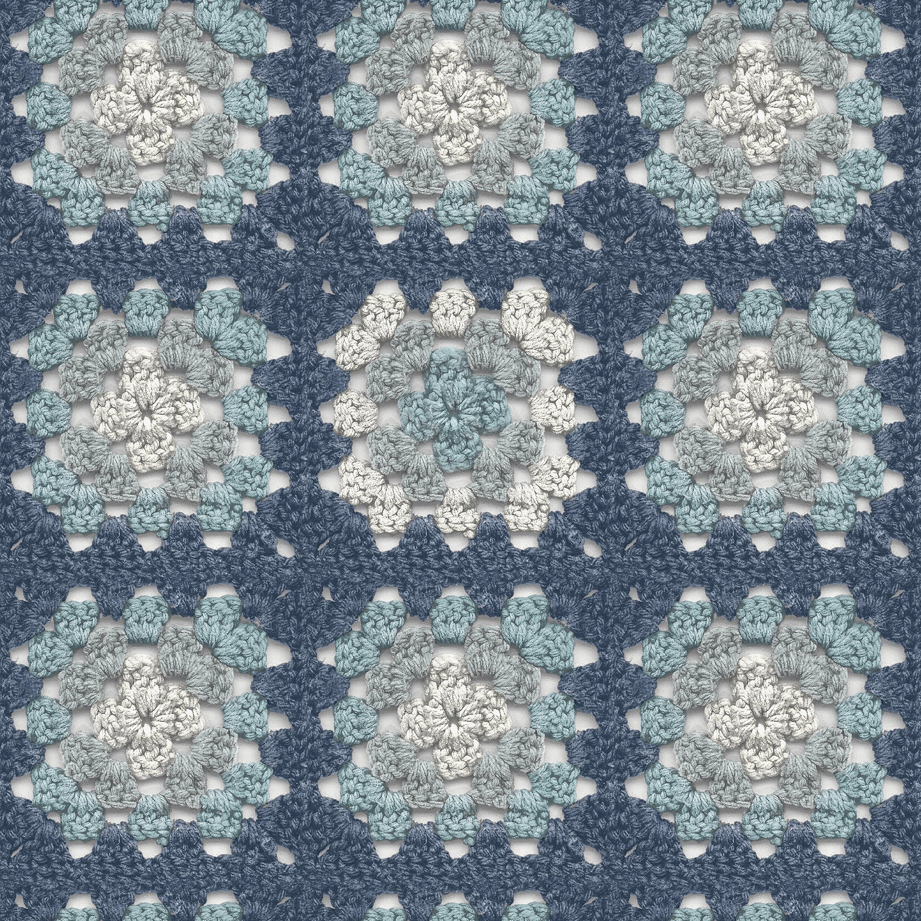 Create a space that radiates the comfort of a hand-crocheted afghan! Teal, coral, and mustard inks create the look of a classic granny square over a white background. Maud is a prepasted, non woven blend wallpaper.