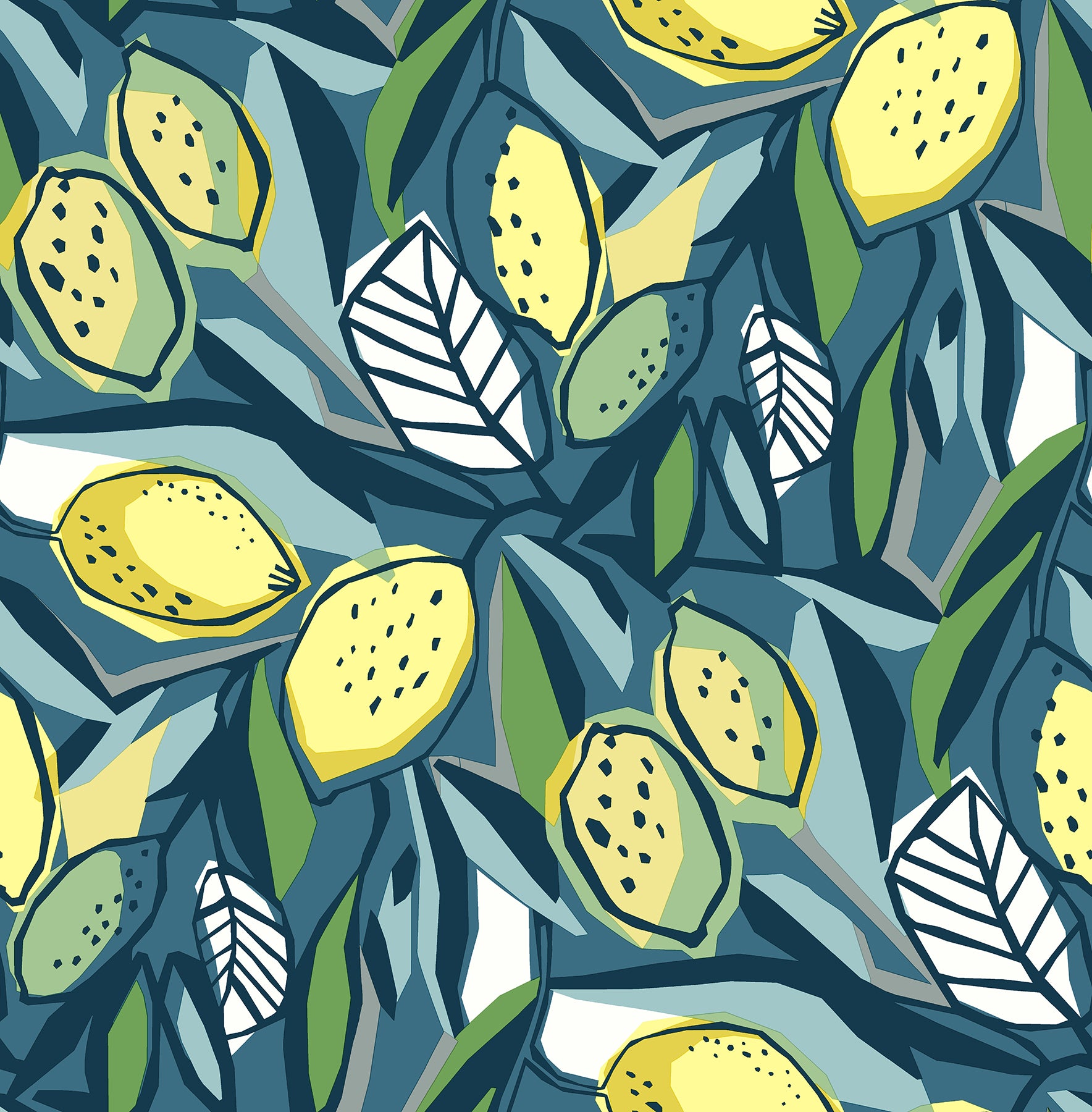 Enjoy a new take on fruit wallpapers with this contemporary citrus design. The lemon trees are artistically stylized with color-blocked details and features an array of olive, teal, chartreuse, rust, white, and beige hues. Meyer is an unpasted, non woven wallpaper.