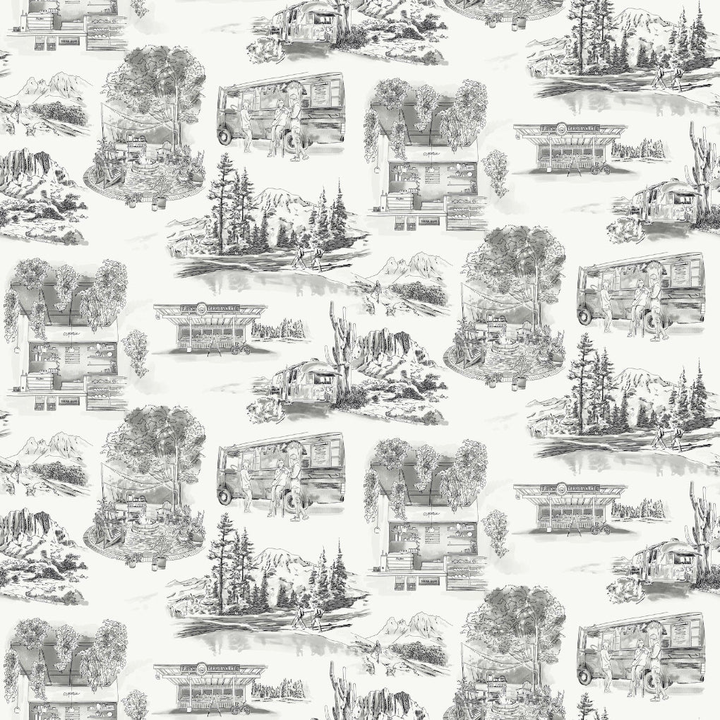 Modern Vista Toile's charming tour of the country features scenic vignettes of road trip travels simply illustrated with minimal outlines and soft grey watercolors. This Modern Vista Toile Wallpaper measures approximately 27 inches wide by 27 feet long, measuring approximately 60.8 square feet per roll. The quintessential design for timeless romance, toile traces its origins to 18th century fabrics. This celebrated motif is explored with a range of classical reproductions and modern re-imaginings.