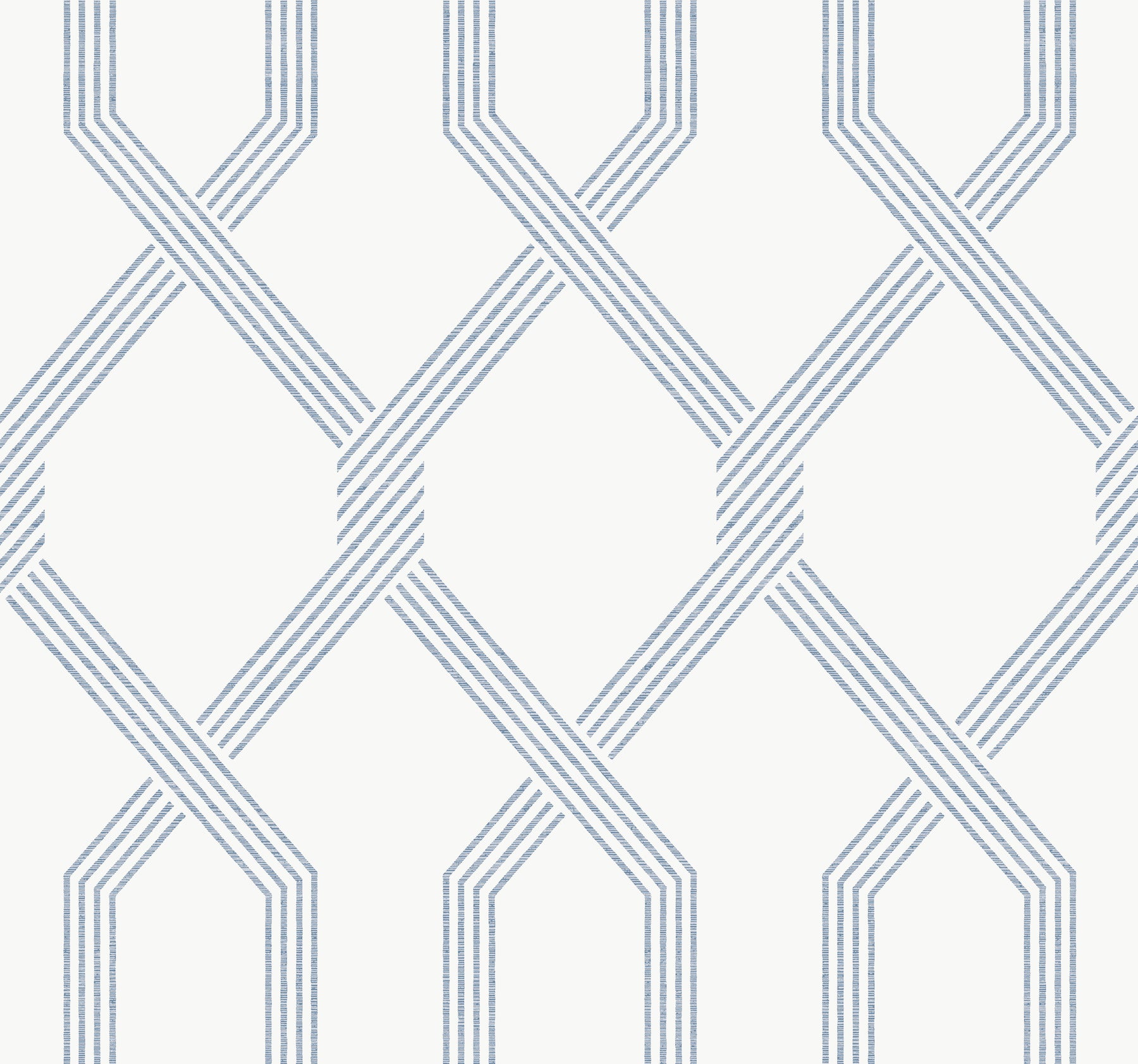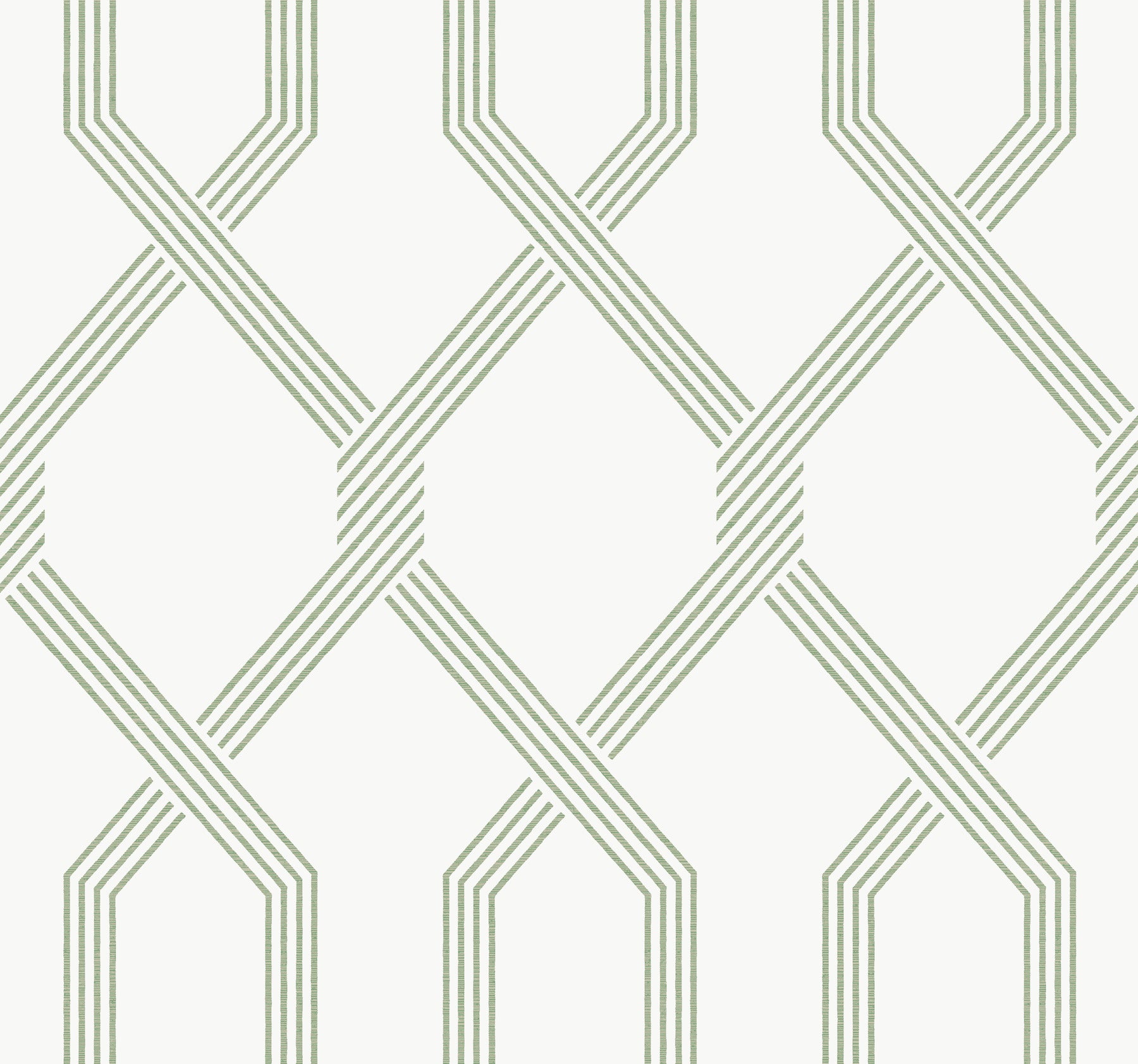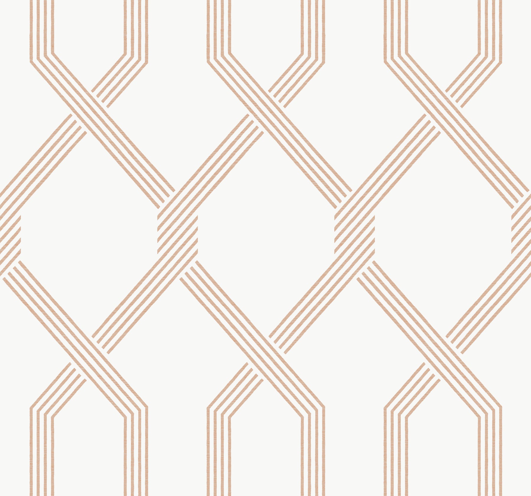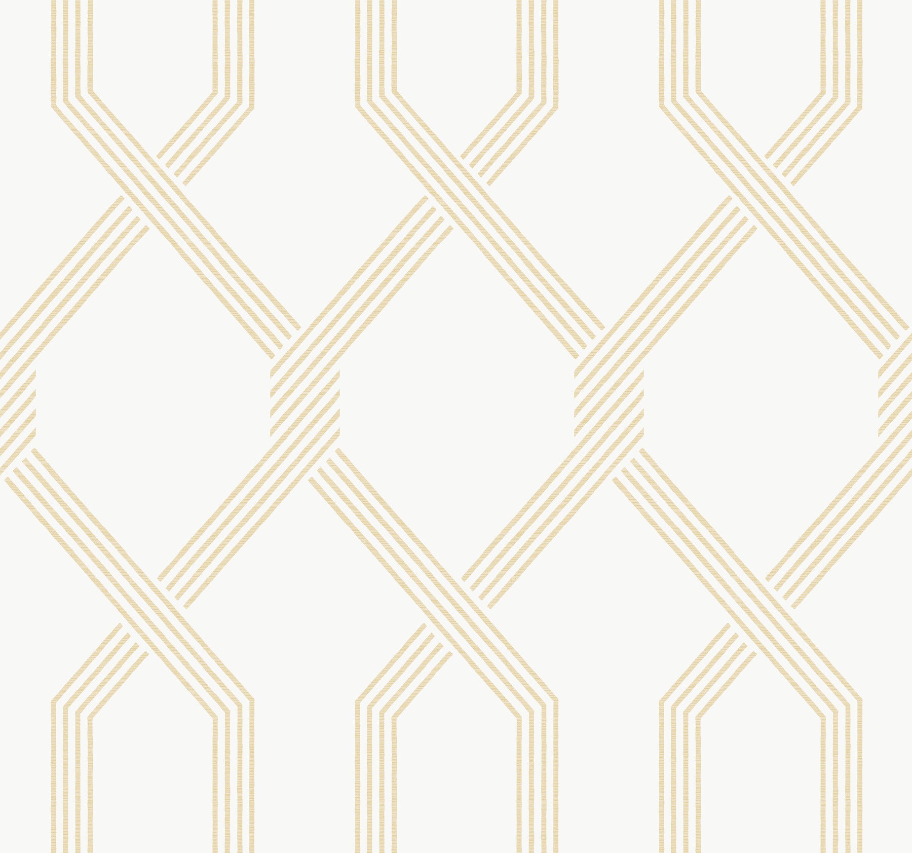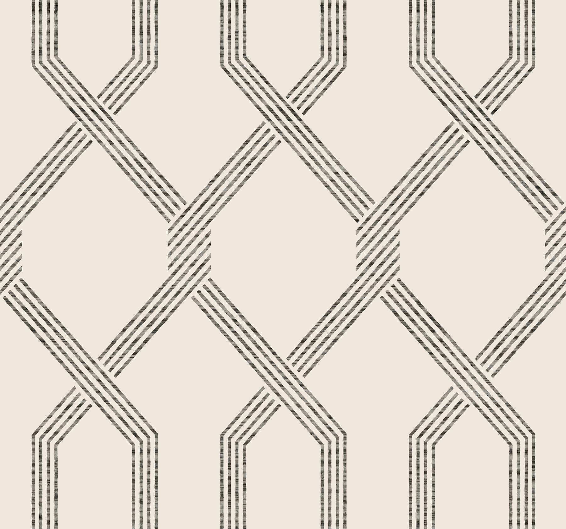 Oversized diamonds within Palisade form as the geometric crossing of lines twist into a ribbon of angled stripes, shown in beige neutrals on white. This Palisade Wallpaper measures approximately 27 inches wide by 27 feet long, measuring approximately 60.8 square feet per roll. The distinction of timeless style.