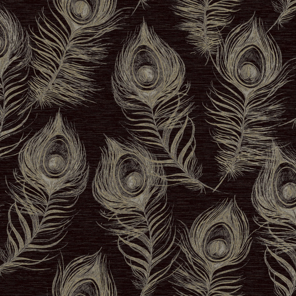 Grey feathers from the train of the peafowl brushed with golden pearlescence create a magnificent display against inky black in pattern Regal Peacock. This Regal Peacock Wallpaper measures approximately 27 inches wide by 27 feet long, measuring approximately 60.8 square feet per roll. Organic simplicity and lustrous adornment for the modern home.