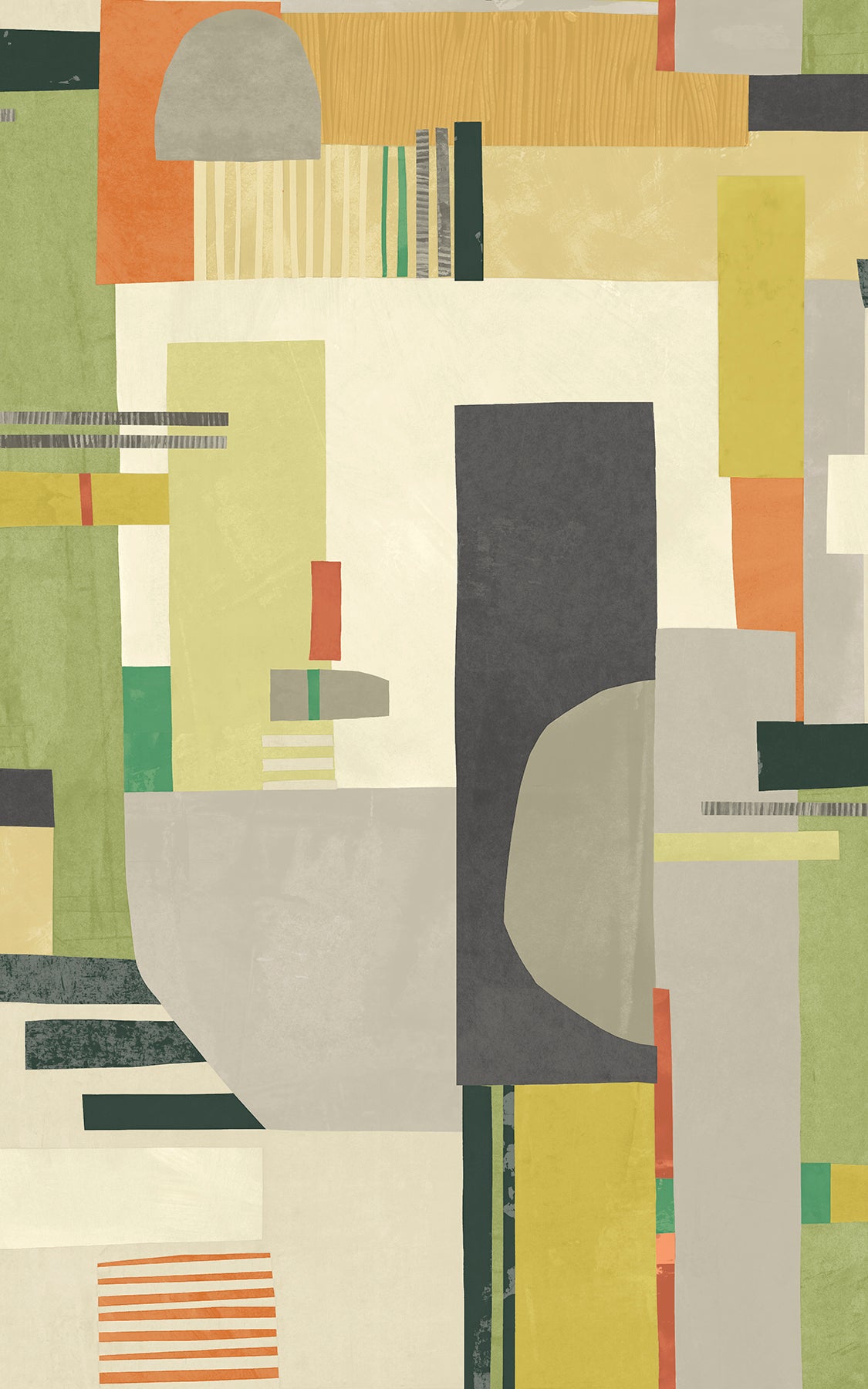 Color and form are raised to new heights in this geometric wallpaper. A variety of solid and textural shapes overlap one another, the warm red color palette accent with touches of blue giving this abstract design retro appeal. Rhodes is an unpasted, non woven wallpaper.