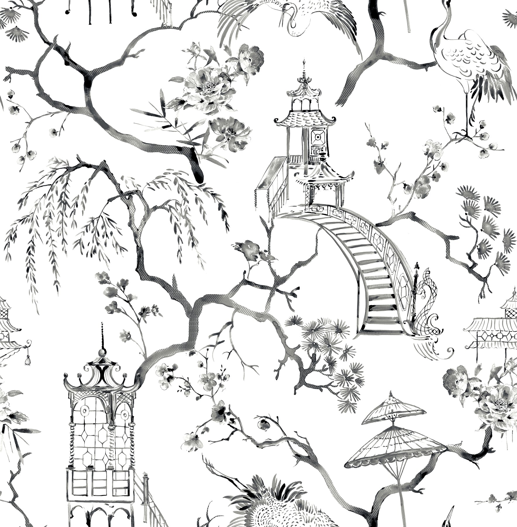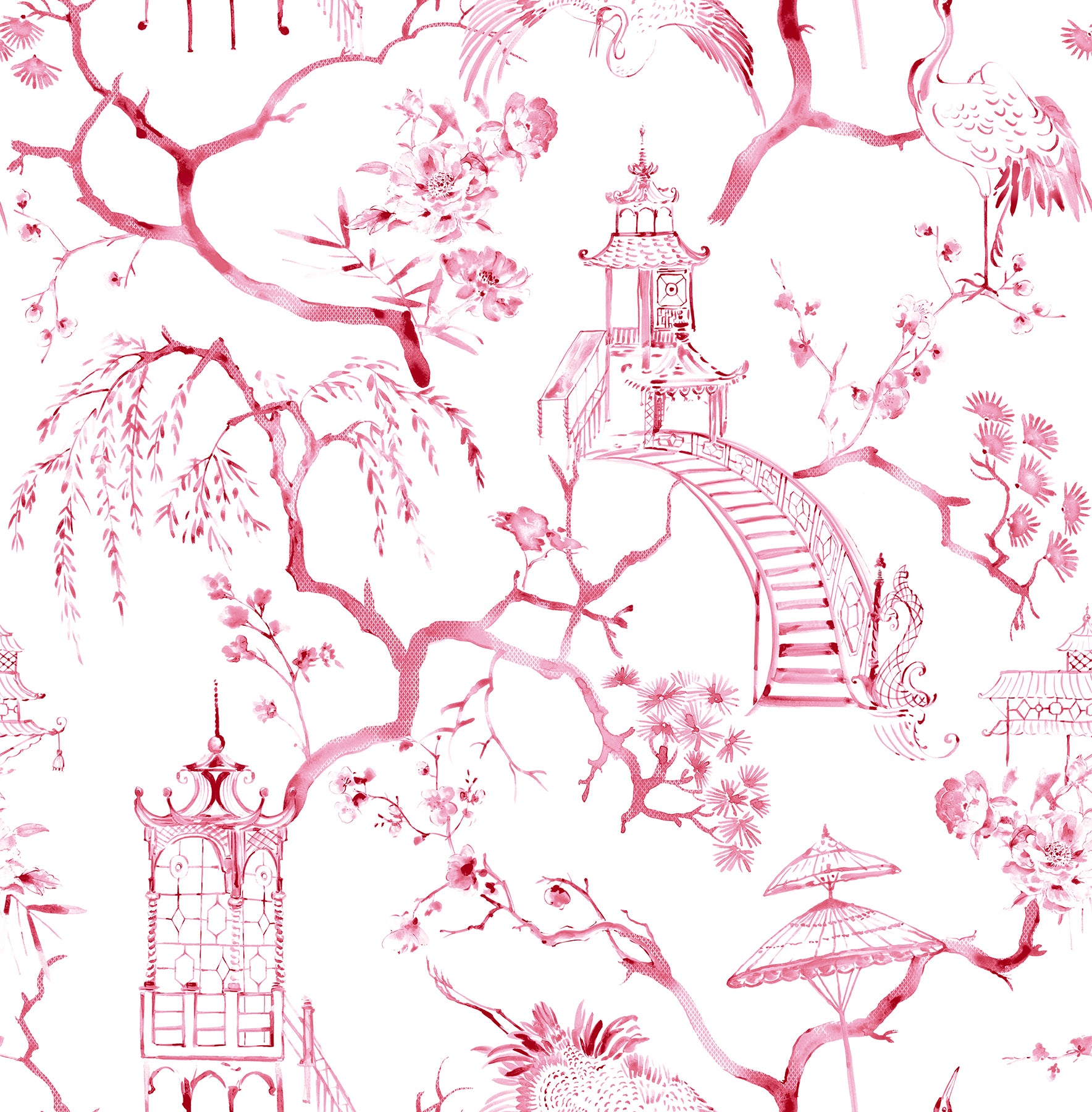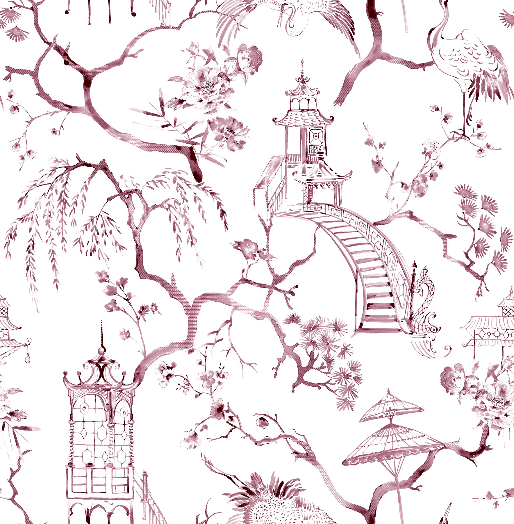 Classic chinoiserie charm is reinvigorated in rich hues. This timeless toile design features flowering trees, elegant cranes, tranquil pagodas, and parasols, all inked in rich plum watercolors periodically imprinted with a diminutive diamond motif. Serena is an unpasted, non woven wallpaper.