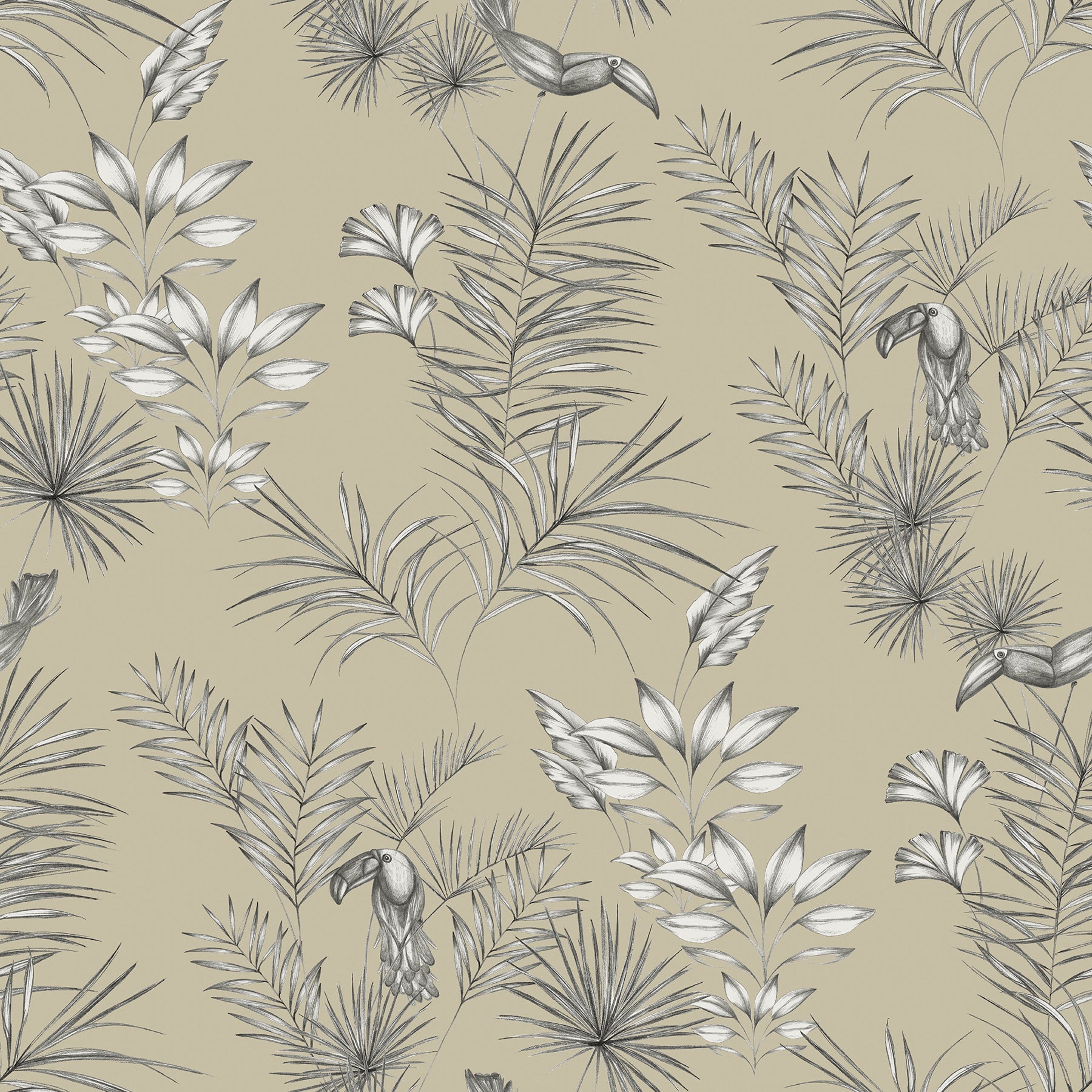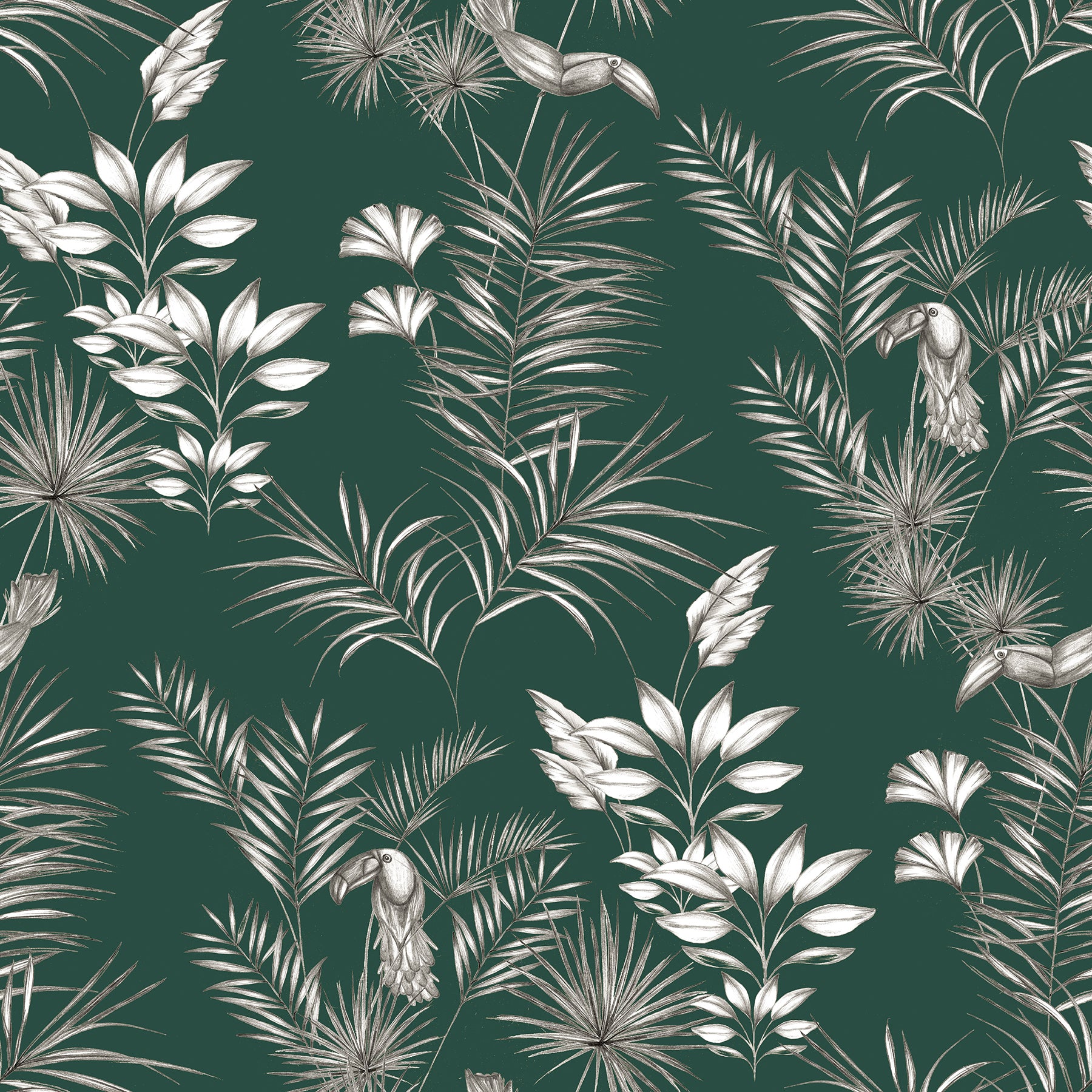 Bring rich color and tropical-chic style to your interiors with this emerald green wallpaper. The tropical flora and restful toucans in this botanical design are illustrated in white and black ink. Shelly is an unpasted, non woven wallpaper.