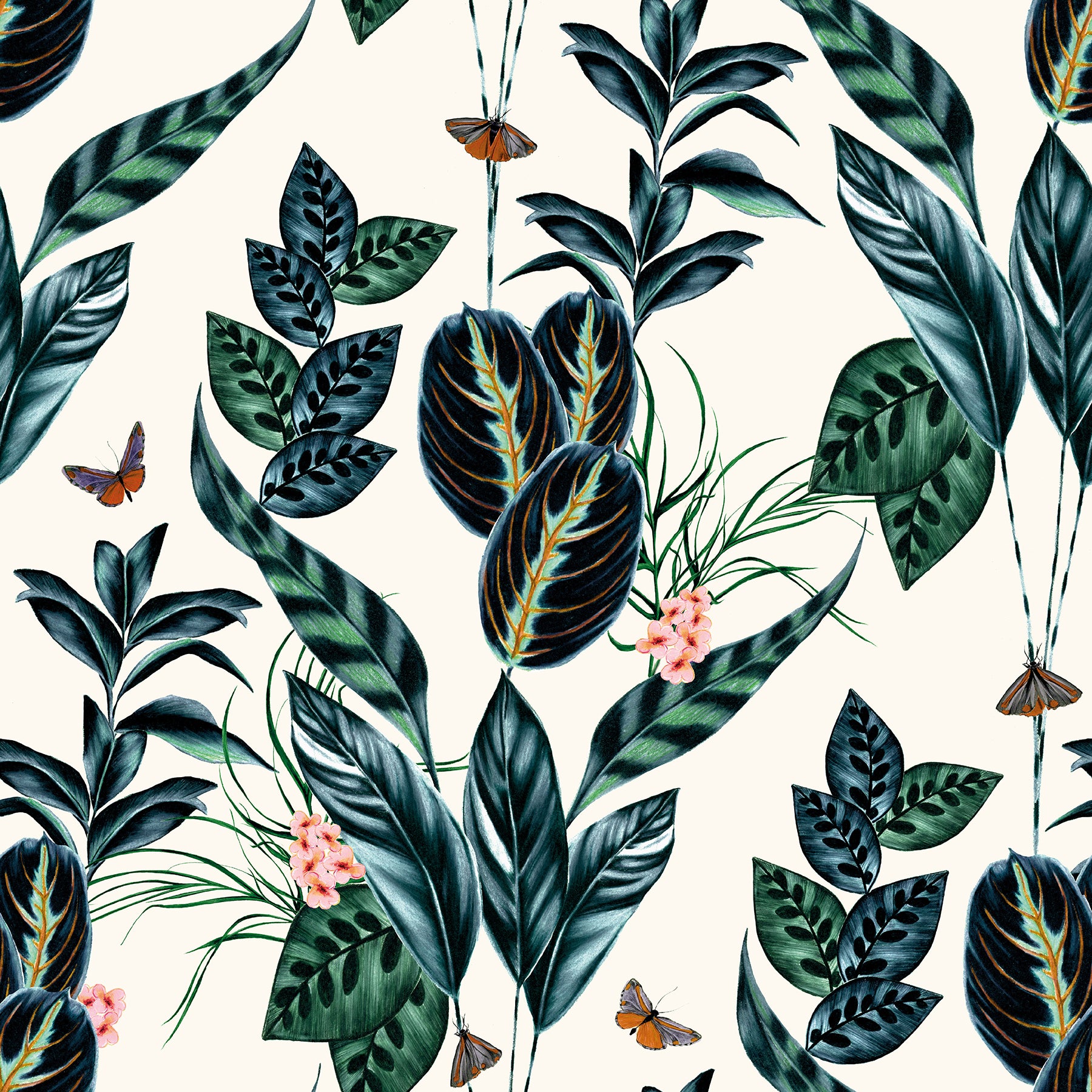 Add the perfect touch of feminine, tropical-chic flair to any room with this botanical wallpaper. The light ackdrop and vivid greenery will add beauty and a sense of peace to your interiors. Spirit is an unpasted, non woven wallpaper.