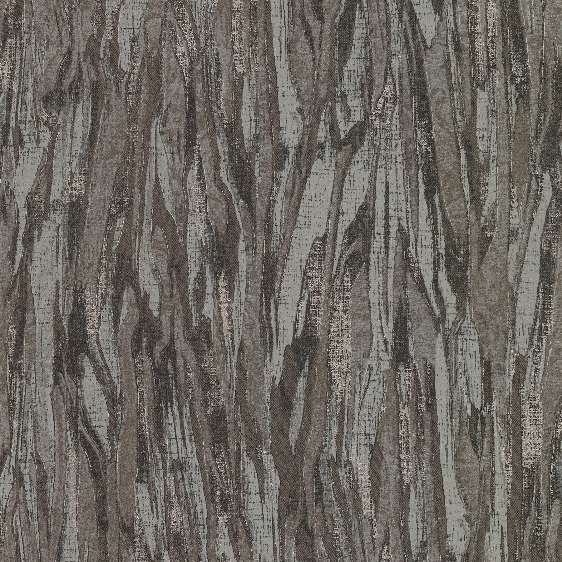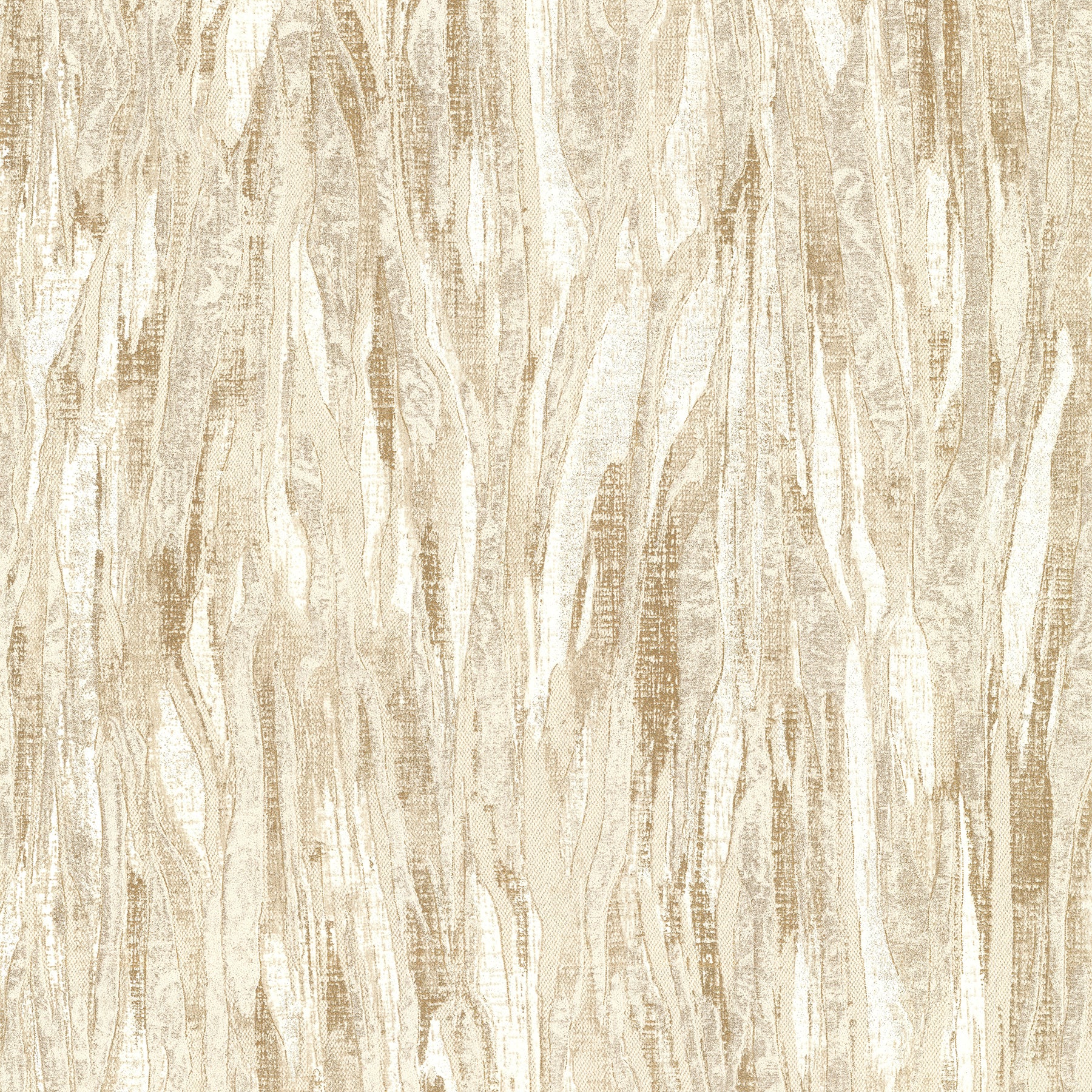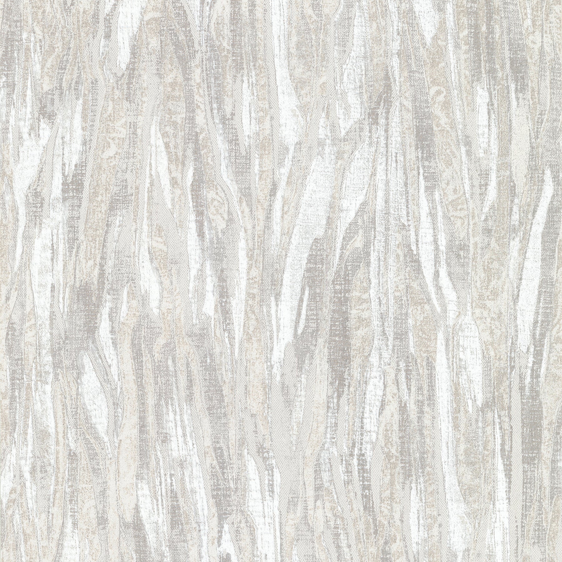 This nature-inspired wallpaper will add elegant texture to your interiors. A blend of taupe and soft greysis layered with thick, wavering sections of cream and metallic silver that look like wide stripes of woodgrain. Suna is an unpasted, foil on non woven wallpaper.