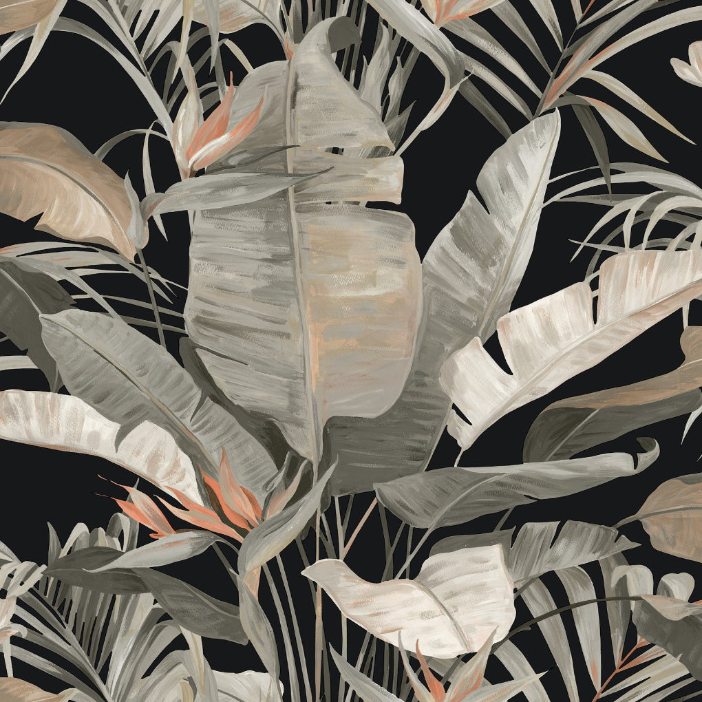 Painterly banana leaf palms and open-air gazebos set the stage for the colorful luxury resort feel of pattern Tropical Cabana, shown in green with dusty coral on midnight black. This Tropical Cabana Wallpaper measures approximately 20.5 inches wide by 27 feet long, measuring approximately 46.1 square feet per roll. Finding beauty in this extraordinary organic world.
