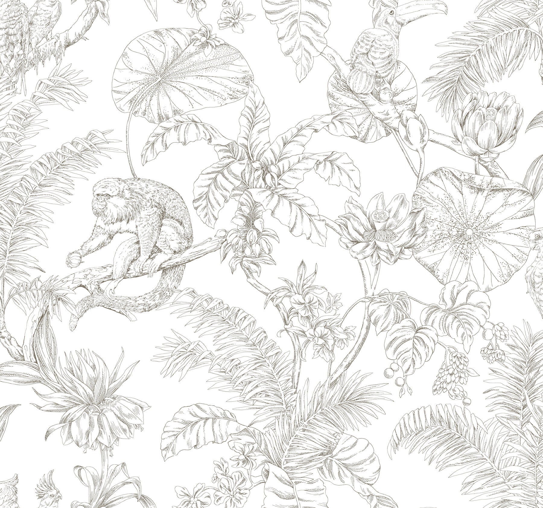 The simple and airy stylings of Tropical Sketch Toile are inked in thin lines against white. This Tropical Sketch Toile Wallpaper measures approximately 27 inches wide by 27 feet long, measuring approximately 60.8 square feet per roll. The quintessential design for timeless romance, toile traces its origins to 18th century fabrics. This celebrated motif is explored with a range of classical reproductions and modern re-imaginings.