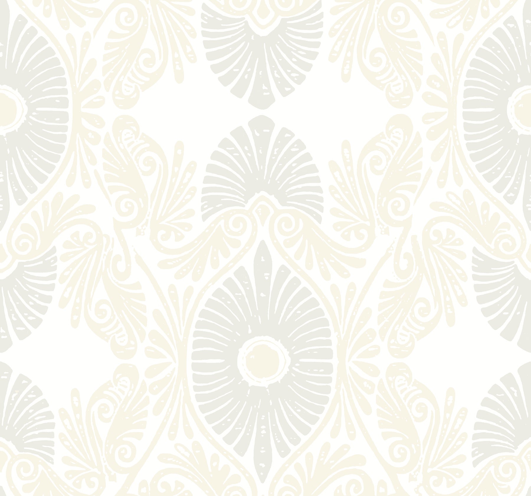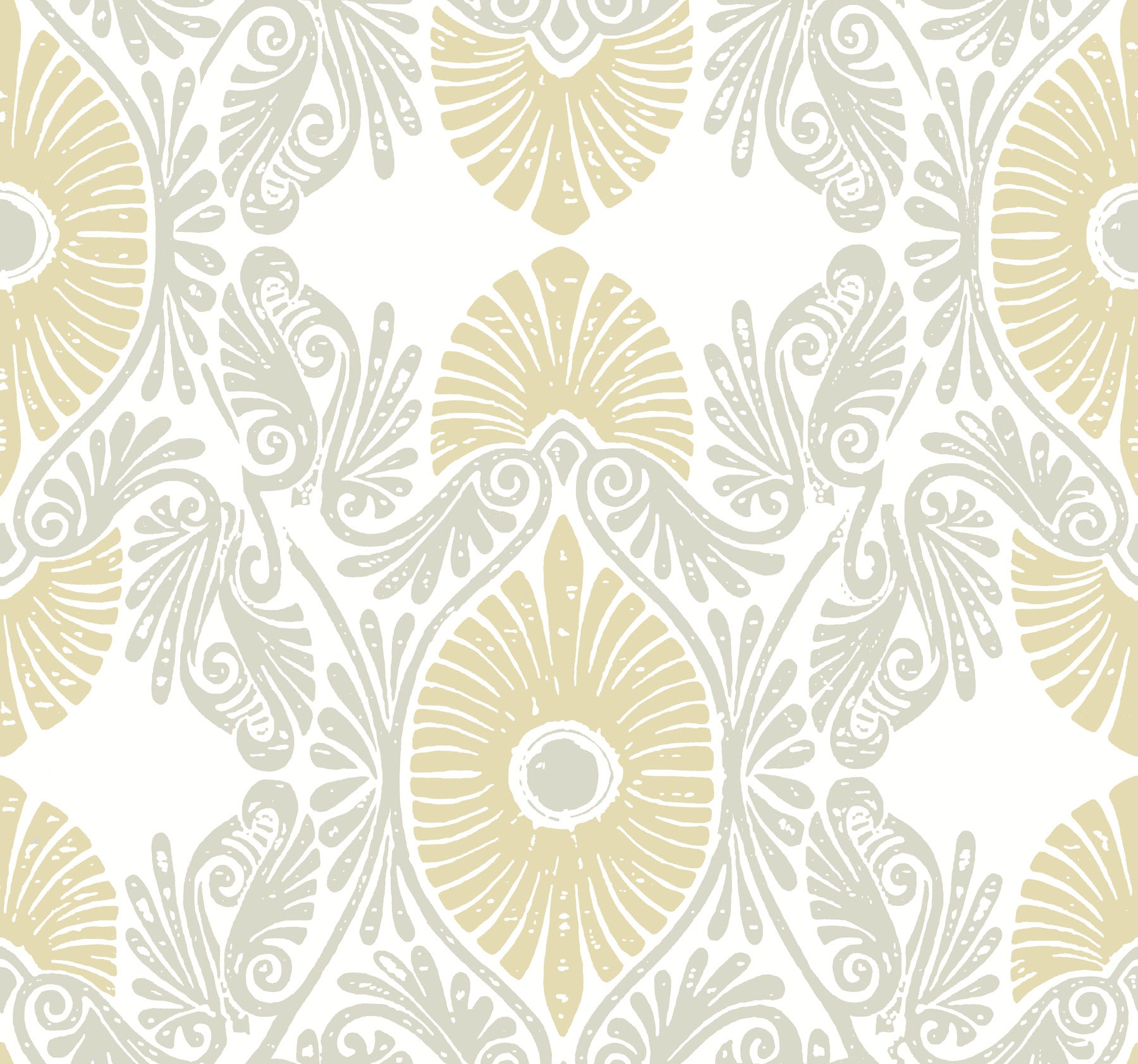 Enjoy rich bohemian flair with this stunning ogee wallpaper. Pale ochre floral medallions are framed by ornate grey scrollwork to create this flowing pattern. Villa is an unpasted, non woven wallpaper measuring 27 inches wide by 27 feet long, covering approximately 60.8 square feet per roll.