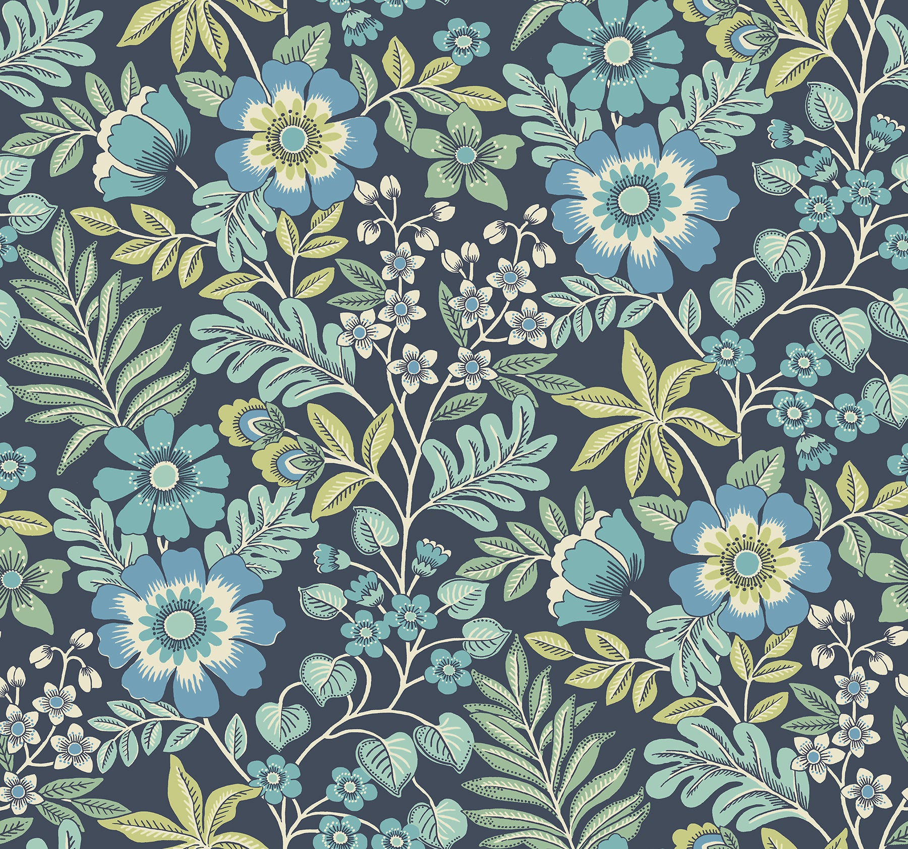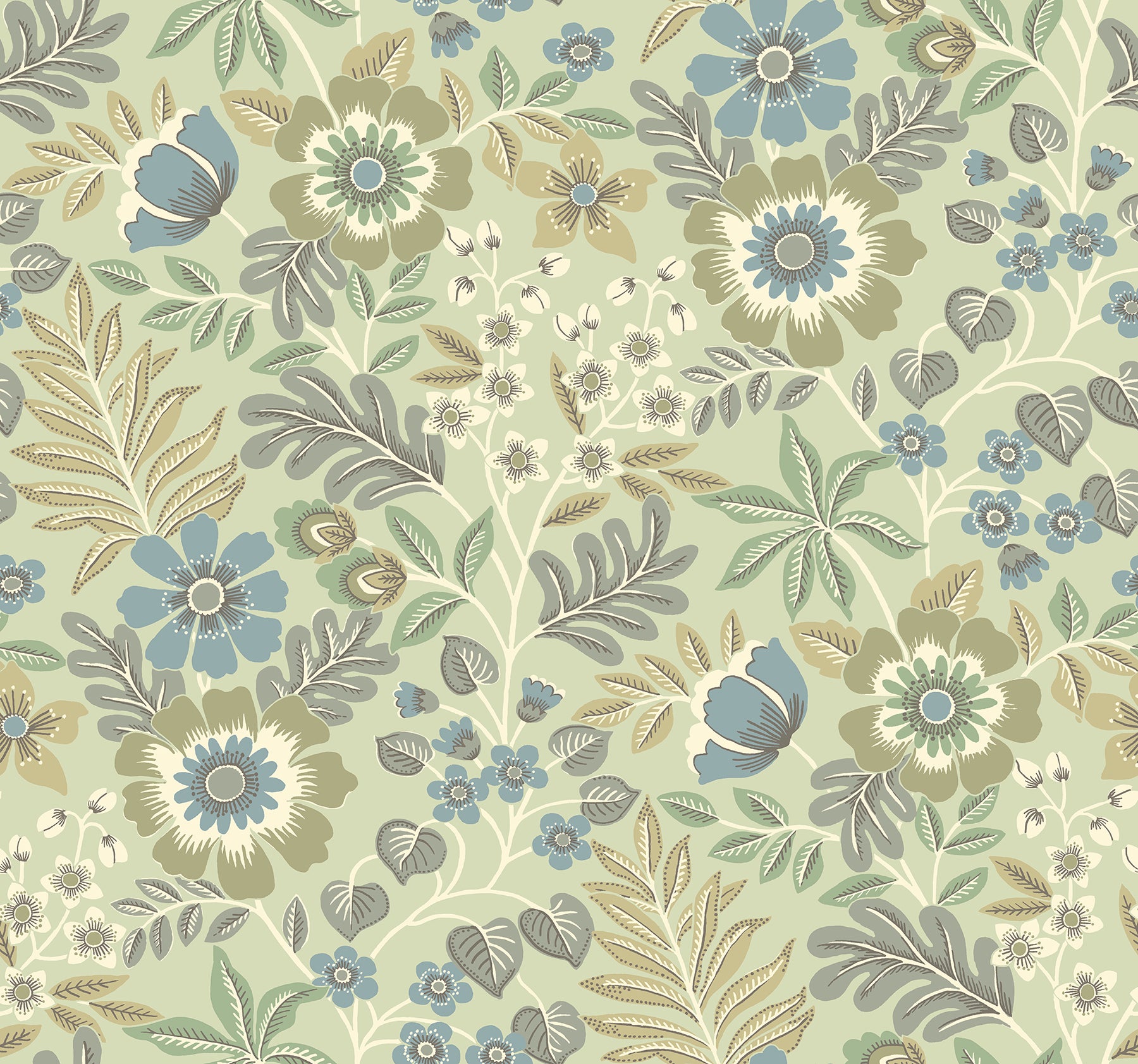 Charming with a slightly retro appeal, this floral wallpaper will breathe new life into your home. The soft color palette of light greens, greys, blues and taupe adds to the appeal of this illustrated design. Voysey is an unpasted, non woven wallpaper.