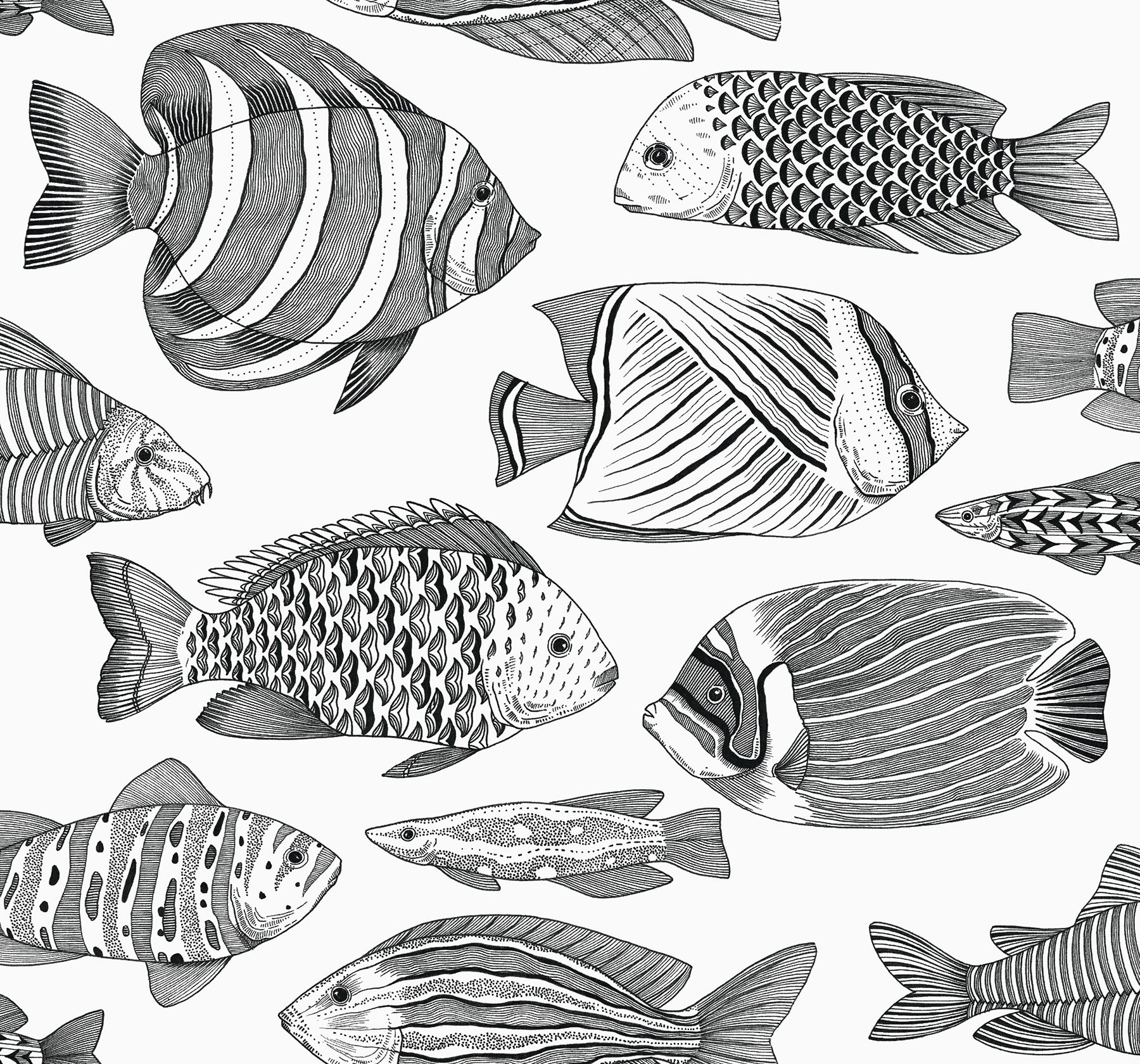 This whimsical animal wallpaper brings a bustling school of tropical fish to your walls. Each fish and its scales are intricately detailed in an array of black inked patterns against a white backdrop. Wailea is an unpasted, gravure acrylic coated wallpaper.