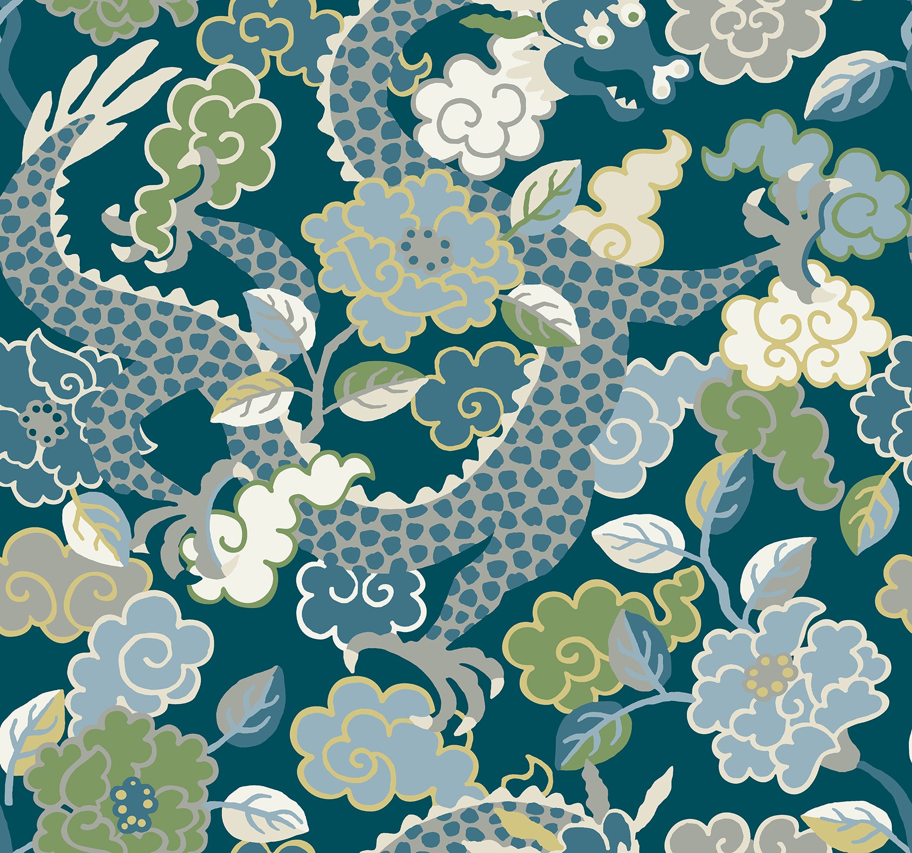 Go bold and beautiful with the elegance and epic-ness of this dragon design. The mythical beast is adorned in a pelt of green on aqua and winds between towering flowers and swirling clouds in an array of tangerine, raspberry, blue, white, and lime. Metallic gold accents add extra majesty to this wallpaper and are especially striking against the black background. Yanci is an unpasted, non woven wallpaper.