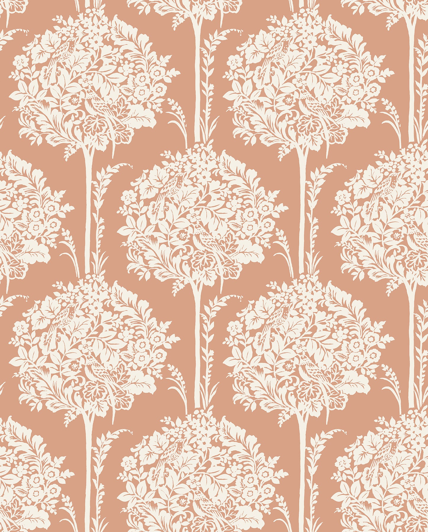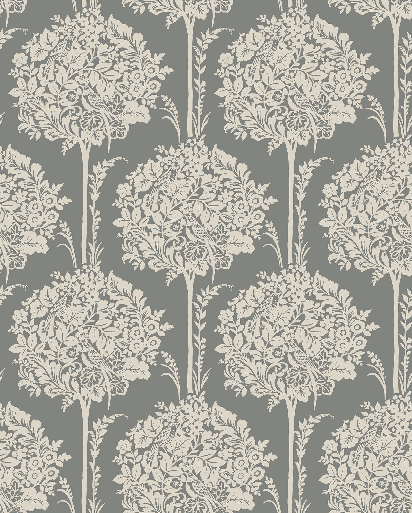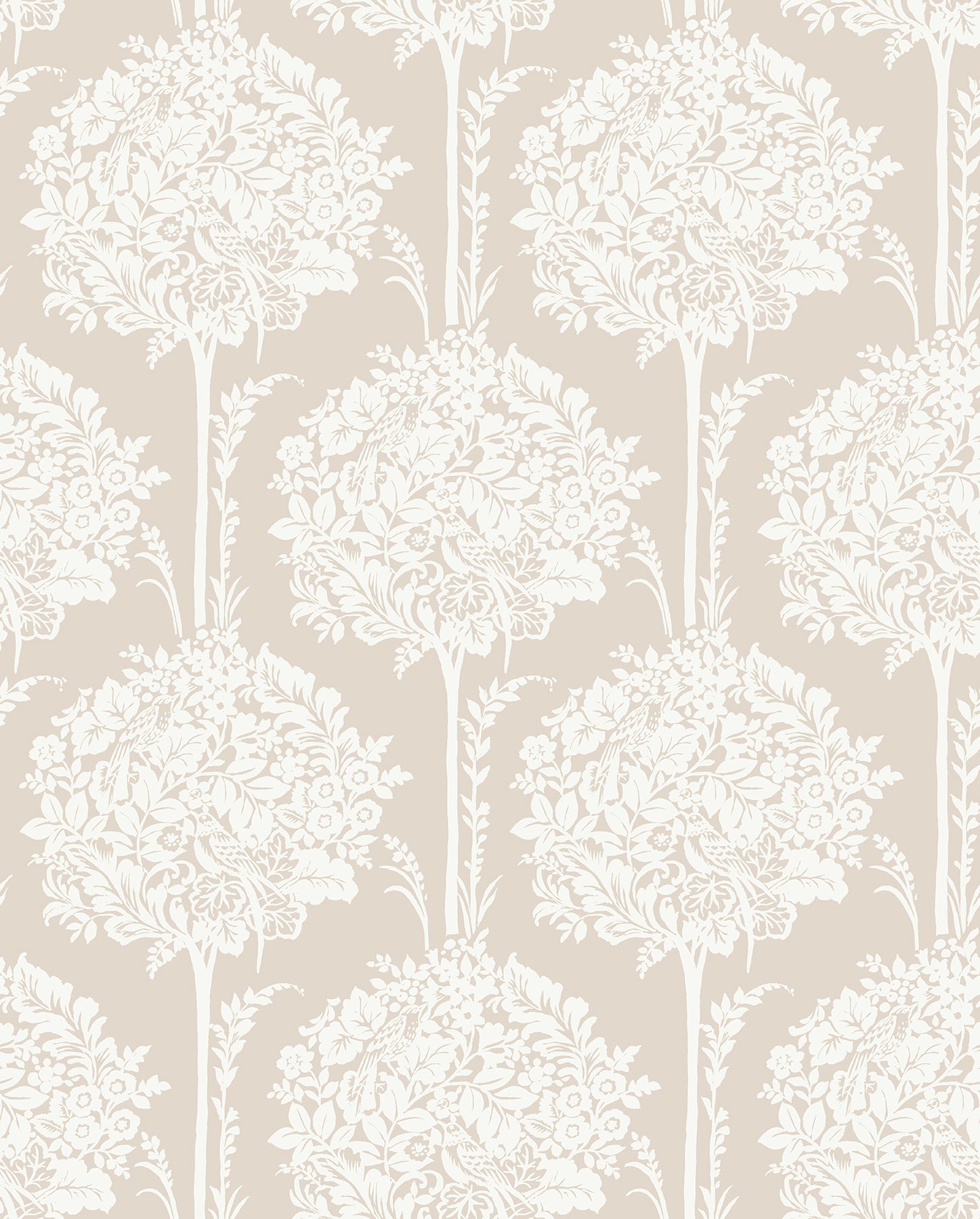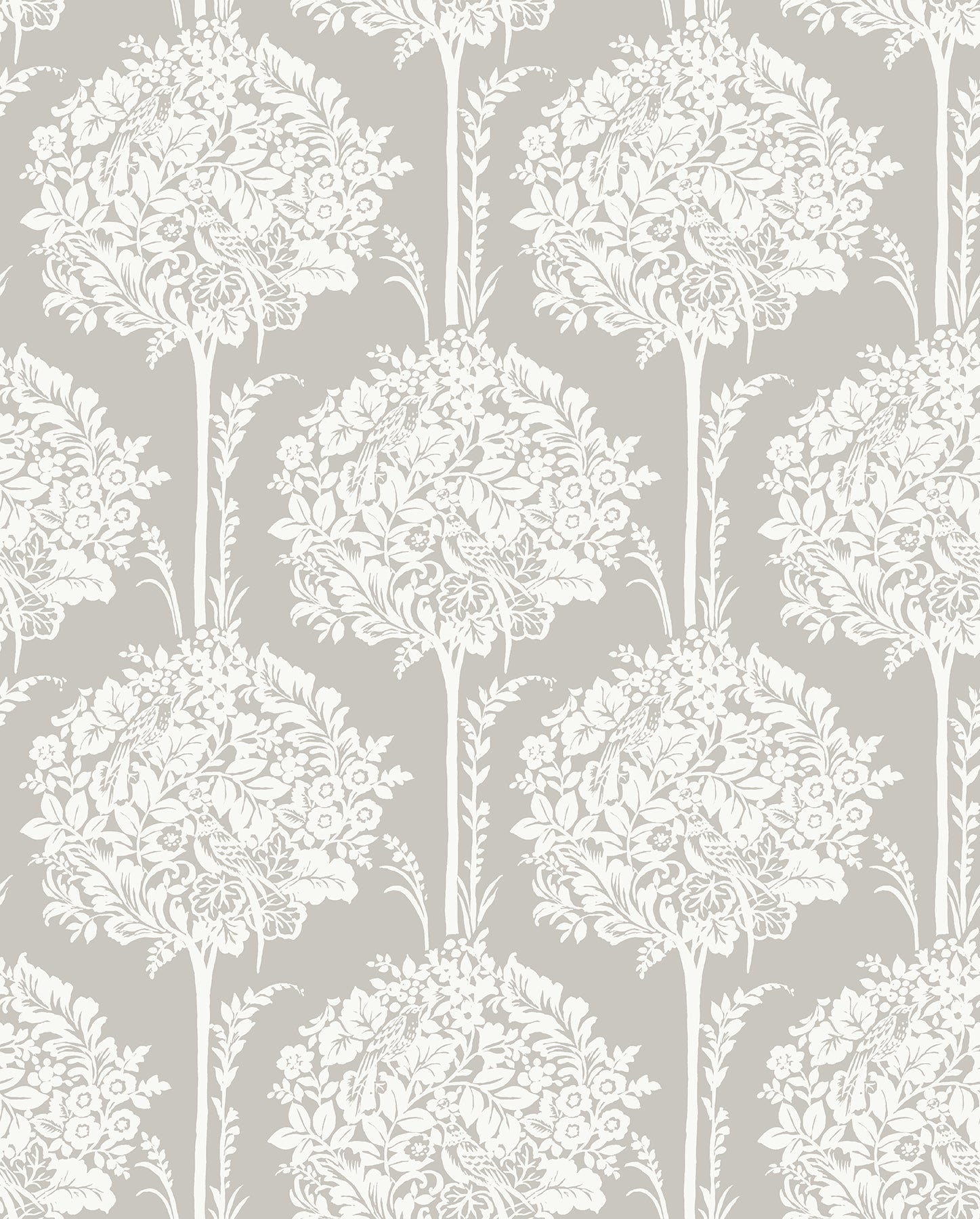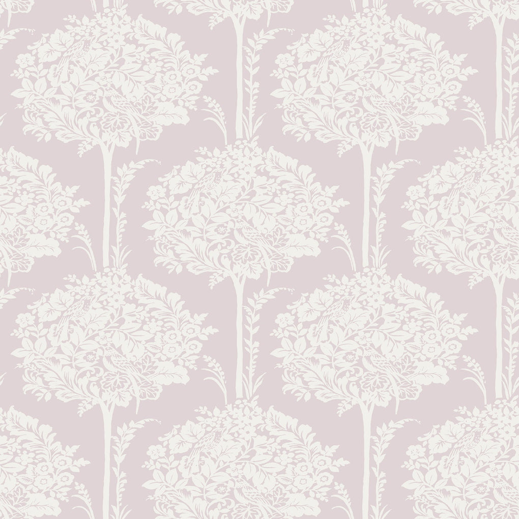 Enjoy an infusion of traditional elegance and modern color with this stunning wallpaper. Staggered columns of manicured topiaries, featuring birds perched among flowering branches, are stamped in white along a delicate lavender backdrop. Zaria is an unpasted, non woven wallpaper.